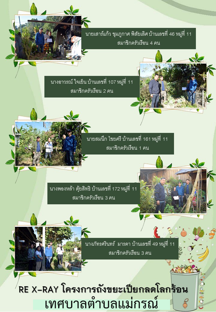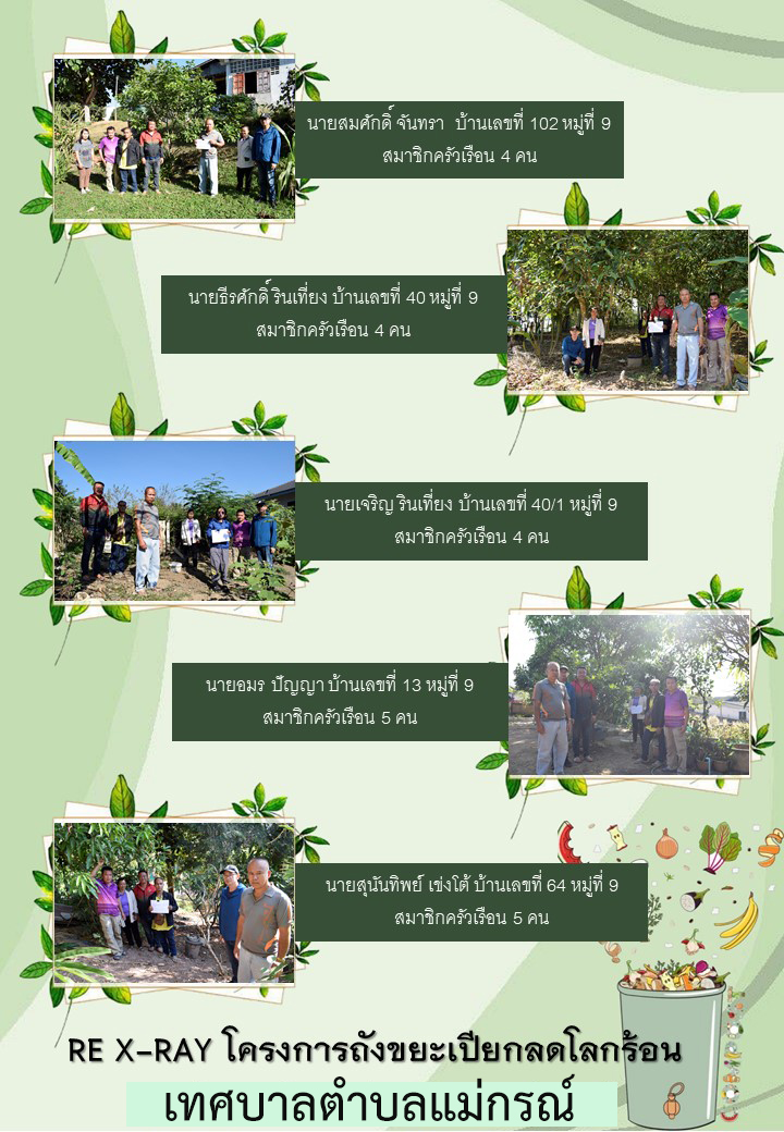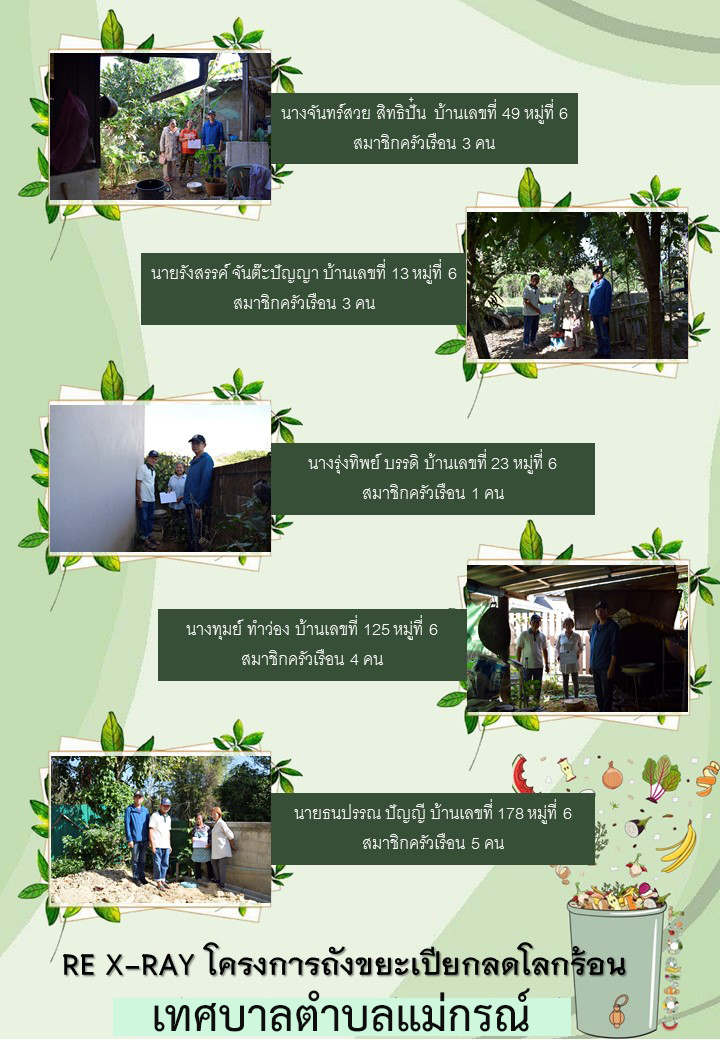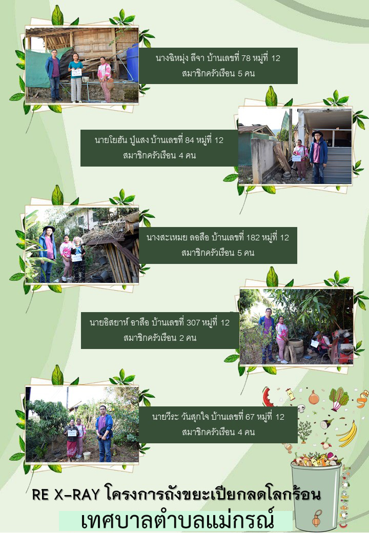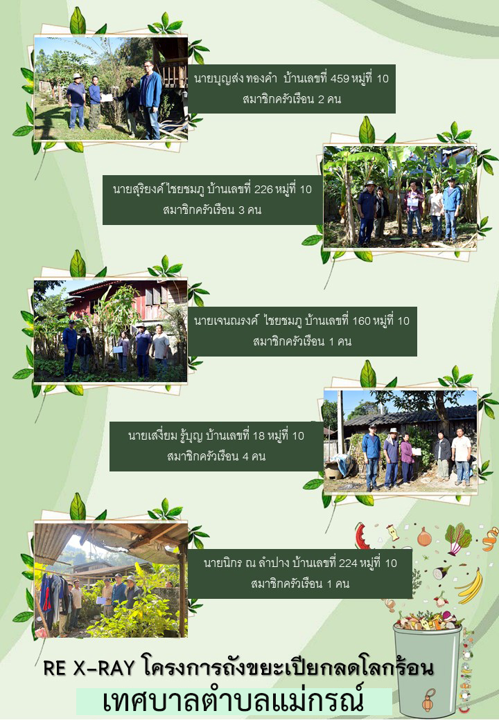 ขับเคลื่อนแผนปฏิบัติการเชิงกลยุทธ์แนวใหม่ RE-X-RAY โครงการถังขยะเปียก ลดโลกร้อนเพื่อบรรลุเป้าหมายการปล่อยก๊าซเรือนกระจกสุทธิเป็นศูนย์ วันที่ 13 - 16 มกราคม 2569 ลงพื้นที่ขับเคลื่อนแผนปฏิบัติการเชิงกลยุทธ์แนวใหม่ RE-X-RAY โครงการถังขยะเปียก ลดโลกร้อนเพื่อบรรลุเป้าหมายการปล่อยก๊าซเรือนกระจกสุทธิเป็นศูนย์ โดยลงพื้นที่ร่วมกับ ผู้ใหญ่บ้าน อาสาสมัครสาธารณประจำหมู่บ้าน(อสม.) และอาสาสมัครท้องถิ่นรักษ์โลก ในการขับเคลื่อนแผนปฏิบัติการเชิงกลยุทธ์แนวใหม่ RE-X-RAY โครงการถังขยะเปียก ลดโลกร้อนเพื่อบรรลุเป้าหมายการปล่อยก๊าซเรือนกระจกสุทธิเป็นศูนย์ ทั้งนี้เพื่อดำเนินการตามนโยบายการดำเนินงานด้านการเปลี่ยนแปลงสภาพภูมิอากาศของกระทรวงมหาดไทยโดยทำการสำรวจและตรวจสอบข้อมูลถังขยะเปียกในระดับครัวเรือน และเพื่อส่งเสริมให้แต่ละครัวเรือนสามารถบริหารจัดการขยะได้ด้วยตัวเอง และใช้ประโยชน์จากขยะที่เกิดขึ้น และเพื่อบรรลุเป้าหมายการปล่อยก๊าซเรือนกระจกสุทธิเป็นศูนย์ ในพื้นที่ตำบลแม่กรณ์ ทั้ง 13 หมู่บ้าน