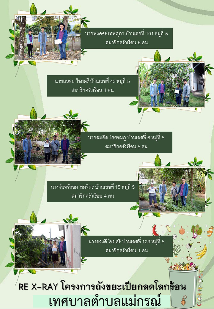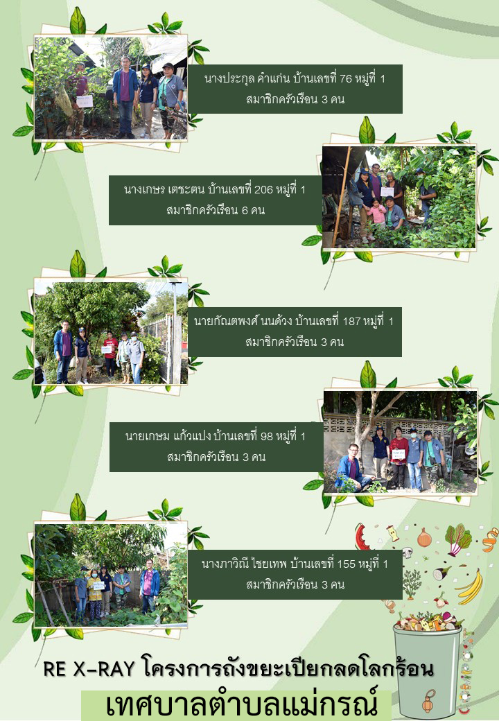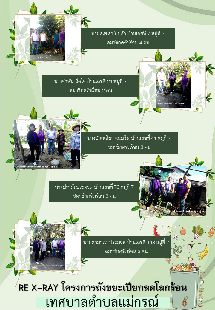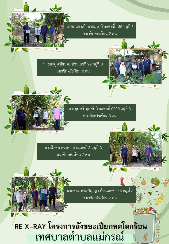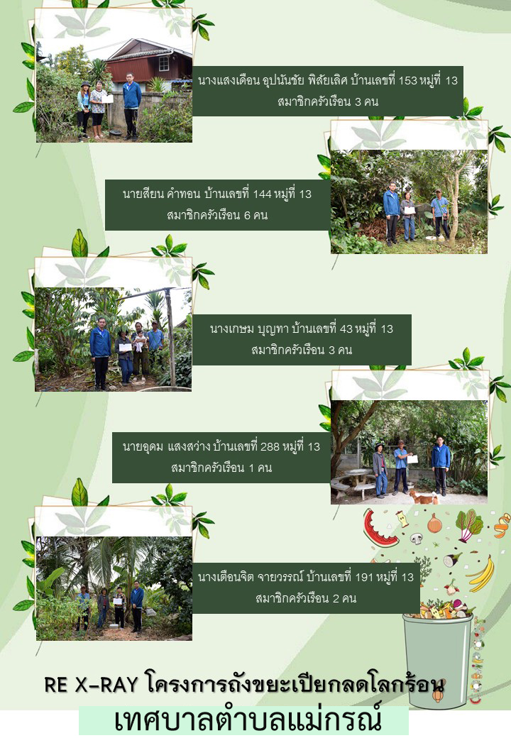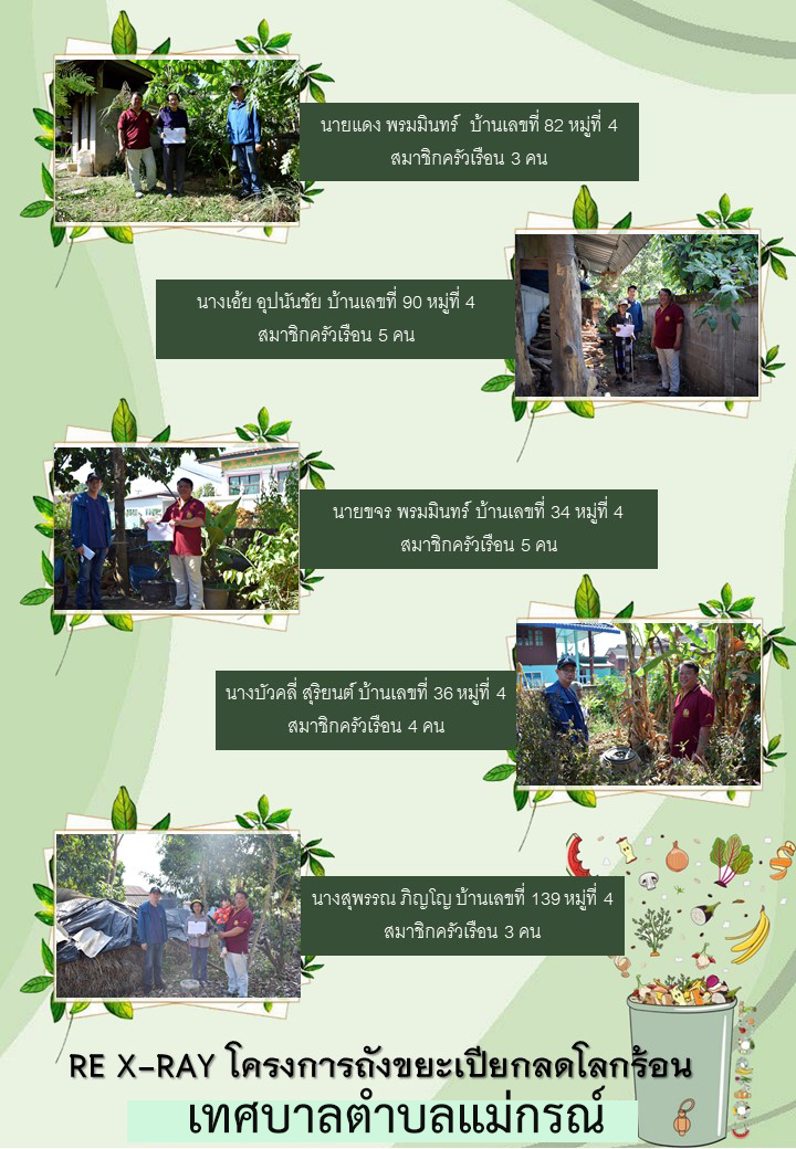 ขับเคลื่อนแผนปฏิบัติการเชิงกลยุทธ์แนวใหม่ RE-X-RAY โครงการถังขยะเปียก ลดโลกร้อนเพื่อบรรลุเป้าหมายการปล่อยก๊าซเรือนกระจกสุทธิเป็นศูนย์ วันที่ 13 - 16 มกราคม 2569 ลงพื้นที่ขับเคลื่อนแผนปฏิบัติการเชิงกลยุทธ์แนวใหม่ RE-X-RAY โครงการถังขยะเปียก ลดโลกร้อนเพื่อบรรลุเป้าหมายการปล่อยก๊าซเรือนกระจกสุทธิเป็นศูนย์ โดยลงพื้นที่ร่วมกับ ผู้ใหญ่บ้าน อาสาสมัครสาธารณประจำหมู่บ้าน(อสม.) และอาสาสมัครท้องถิ่นรักษ์โลก ในการขับเคลื่อนแผนปฏิบัติการเชิงกลยุทธ์แนวใหม่ RE-X-RAY โครงการถังขยะเปียก ลดโลกร้อนเพื่อบรรลุเป้าหมายการปล่อยก๊าซเรือนกระจกสุทธิเป็นศูนย์ ทั้งนี้เพื่อดำเนินการตามนโยบายการดำเนินงานด้านการเปลี่ยนแปลงสภาพภูมิอากาศของกระทรวงมหาดไทยโดยทำการสำรวจและตรวจสอบข้อมูลถังขยะเปียกในระดับครัวเรือน และเพื่อส่งเสริมให้แต่ละครัวเรือนสามารถบริหารจัดการขยะได้ด้วยตัวเอง และใช้ประโยชน์จากขยะที่เกิดขึ้น และเพื่อบรรลุเป้าหมายการปล่อยก๊าซเรือนกระจกสุทธิเป็นศูนย์ ในพื้นที่ตำบลแม่กรณ์ ทั้ง 13 หมู่บ้าน