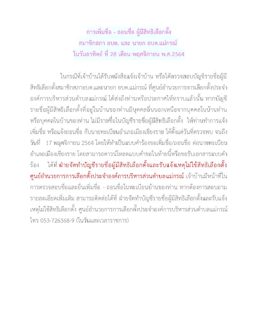 การเพิ่มชื่อ - ถอนชื่อ ผู้มีสิทธิเลือกตั้ง สมาชิกสภา อบต. และ นายก อบต.แม่กรณ์ ในวันอาทิตย์ ที่ 28 เดือน พฤศจิกายน พ.ศ.2564