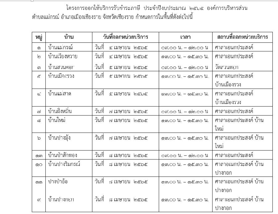 ประชาสัมพันธ์การ ออกหน่วยรับชำระภาษีเคลื่อนที่ ประจำปี 2565 ตามรายละเอียดดังต่อไปนี้