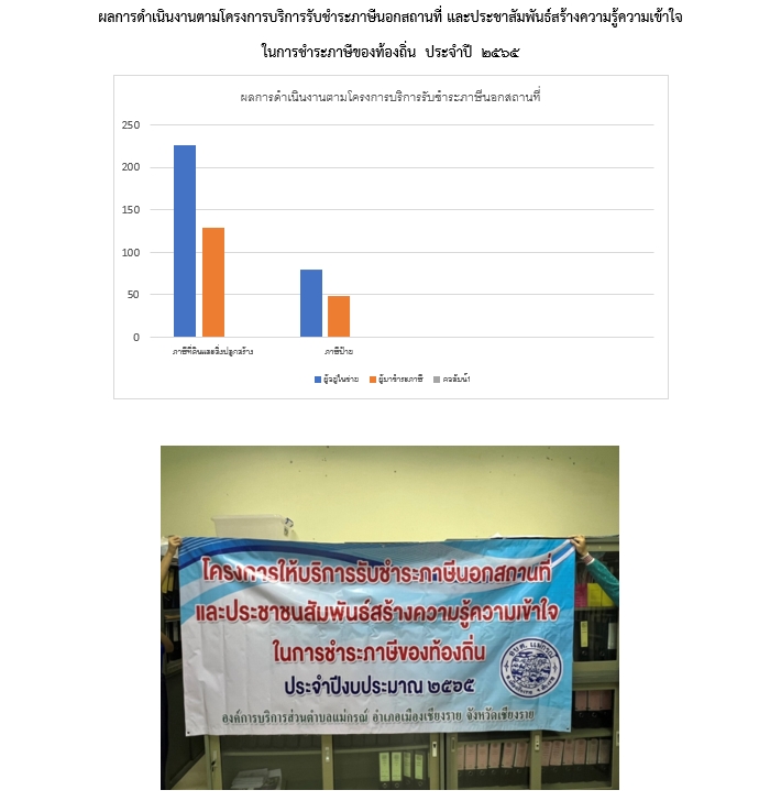 ผลการดำเนินงานตามโครงการบริการรับชำระภาษีนอกสถานที่ และประชาสัมพันธ์สร้างความรู้ความเข้าใจ ในการชำระภาษีของท้องถิ่น ประจำปี 2565