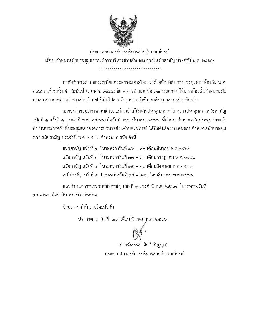 ▶▷▸ประกาศกำหนดสมัยประชุมสภาองค์การบริหารส่วนตำบลแม่กรณ์ ประจำปี 2566✅