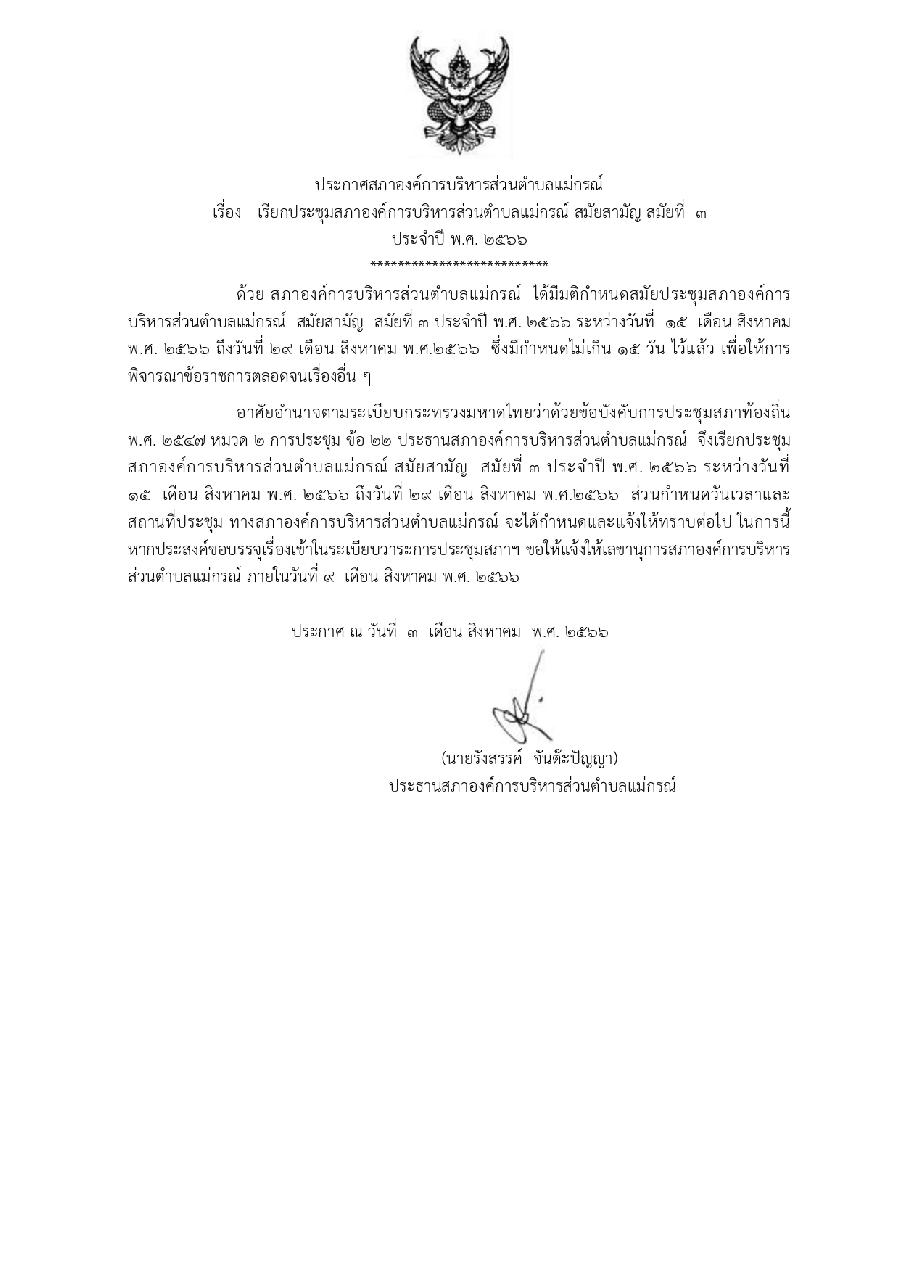 ▶▷▸สภาองค์การบริหารส่วนตำบลแม่กรณ์ เรียกประชุมสภาองค์การบริหารส่วนตำบลแม่กรณ์ สมัยสามัญ  สมัยที่ 3 ประจำปี พ.ศ. 2566 ระหว่างวันที่  15  เดือน สิงหาคม พ.ศ. 2566  ถึงวันที่ 29 เดือนสิงหาคม พ.ศ.2566 ✅