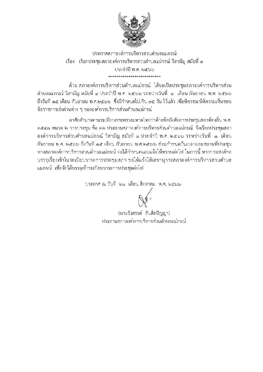 ▶▷▸สภาองค์การบริหารส่วนตำบลแม่กรณ์ เรียกประชุมสภาองค์การบริหารส่วนตำบลแม่กรณ์ สมัยวิสามัญ  สมัยที่ 1 ประจำปี พ.ศ. 2566 ระหว่างวันที่  1  เดือน กันยายน พ.ศ. 2566  ถึงวันที่ 15 เดือน กันยายน พ.ศ.2566 ✅