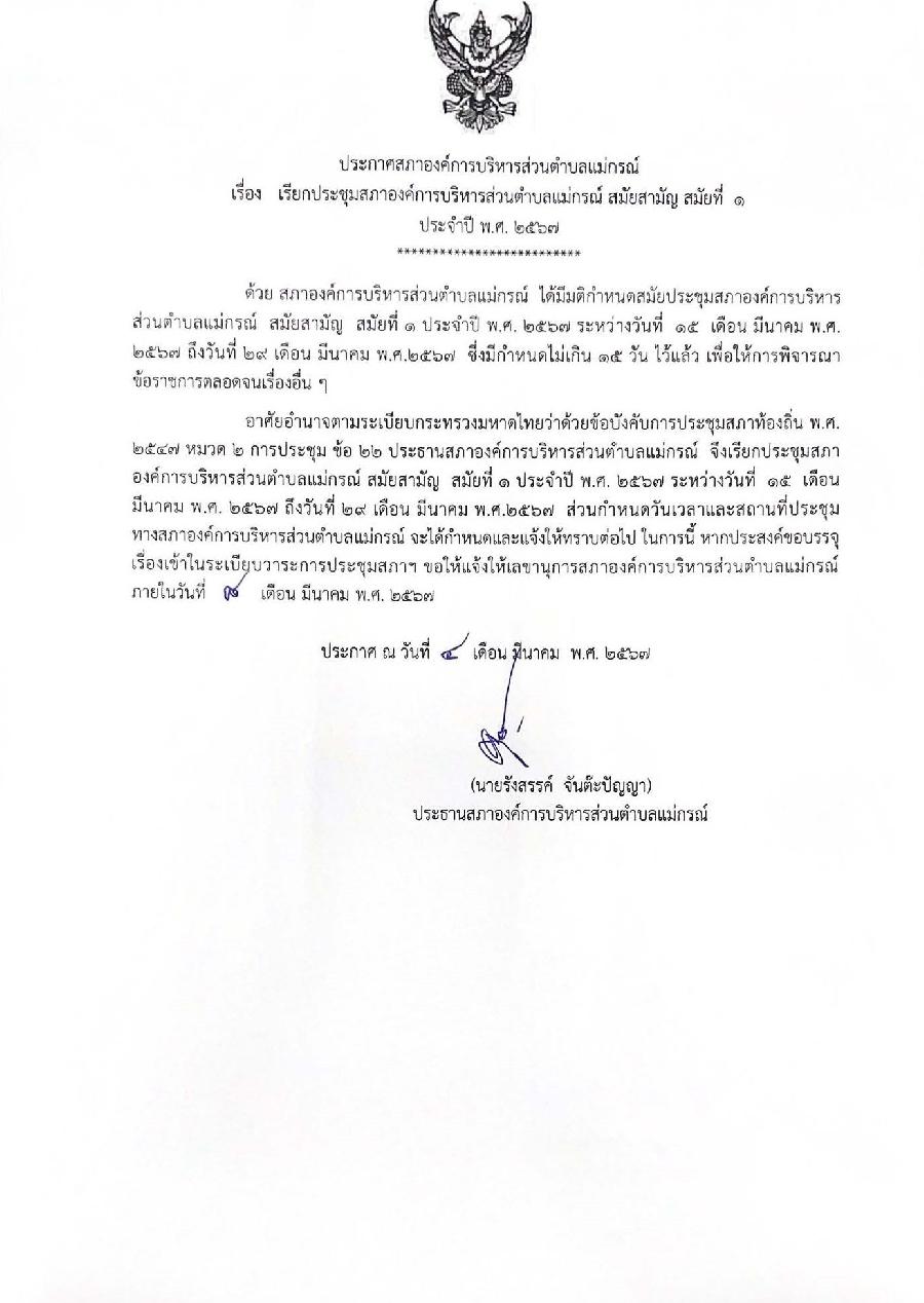 ▶▷▸เรียกประชุมสภาองค์การบริหารส่วนตำบลแม่กรณ์ สมัยสามัญ สมัยที่ 1 ประจำปี 2567✅
