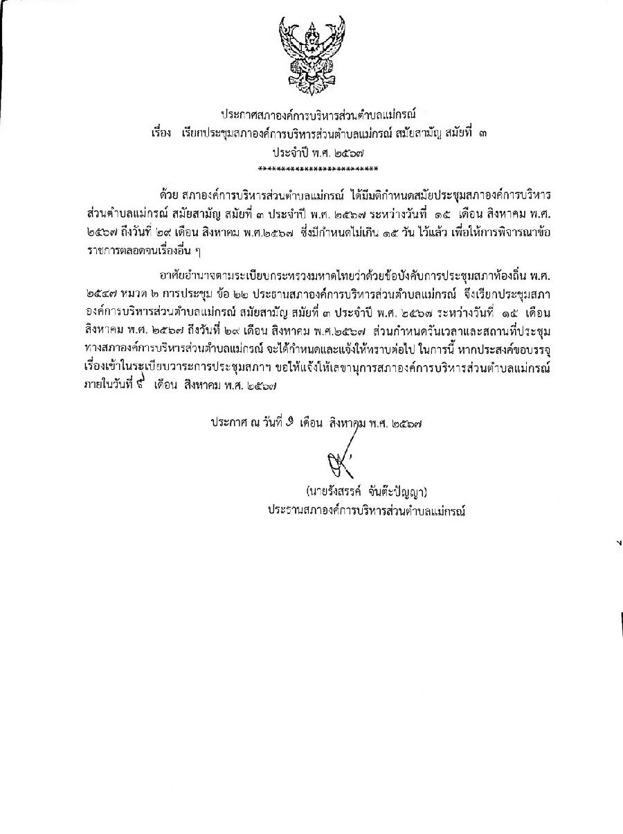 ▶▷▸เรียกประชุมสภาองค์การบริหารส่วนตำบลแม่กรณ์ สมัยสามัญ สมัยที่ 3 ประจำปี 2567✅