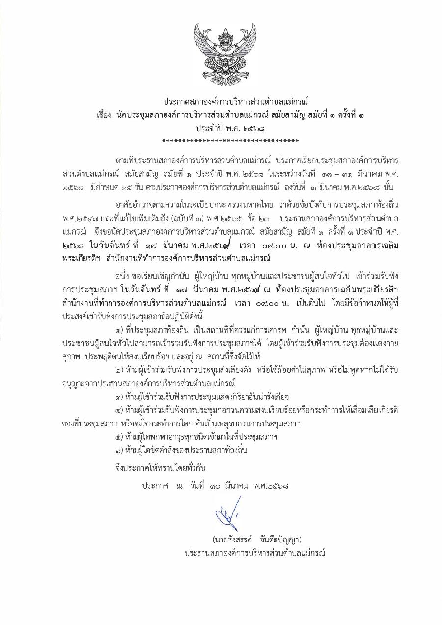 ▶▷▸ขอเชิญเข้าร่วมรับฟังการประชุมสภาองค์การบริหารส่วนตำบลแม่กรณ์ สมัยสามัญ สมัยที่ 1 ครั้งที่ ประจำปี พ.ศ. 2568 ในวันที่ 17 มีนาคม 2568 เวลา 9.00 น. เป็นต้นไป ณ ห้องประชุมเฉลิมพระเกียรติฯ ✅