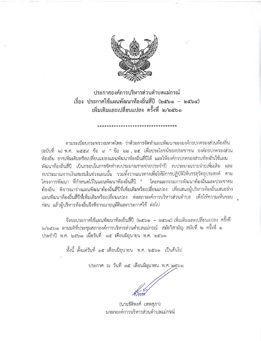 ประกาศใช้แผนพัฒนาท้องถิ่นสี่ปี (2561 - 2564) เพิ่มเติมและเปลี่ยนแปลง ครั้งที่ 2/2561