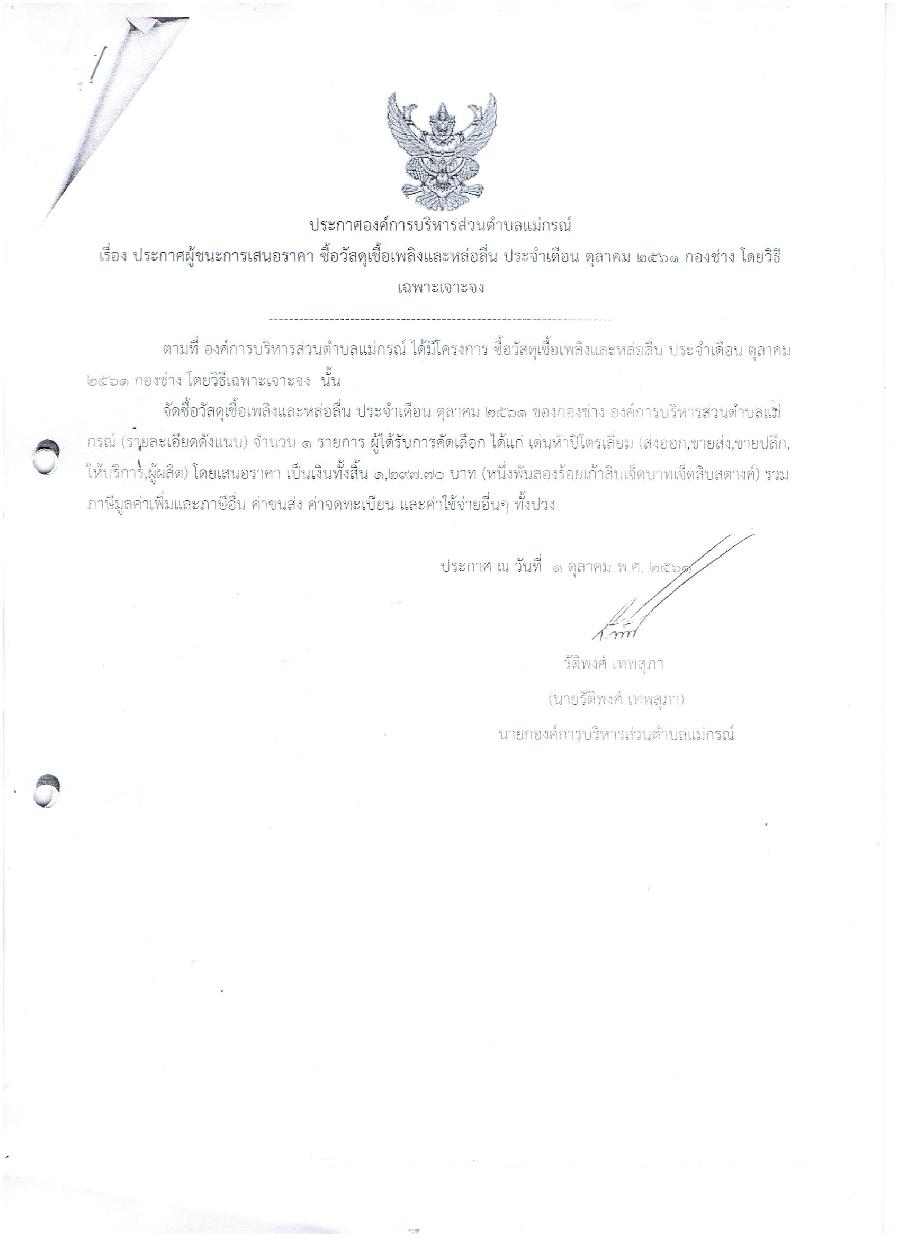 ประกาศผู้ชนะการเสนอราคา ซื้อวัสดุเชื้อเพลิงและหล่อลื่น ประจำเดือน ตุลาคม 2561 กองช่าง