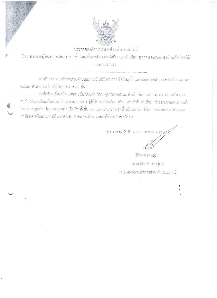 ประกาศผู้ชนะการเสนอราคา ซื้อวัสดุเชื้อเพลิงและหลื่อลื่น ประจำเดือน ตุลาคม 2561 สำนักปลัด