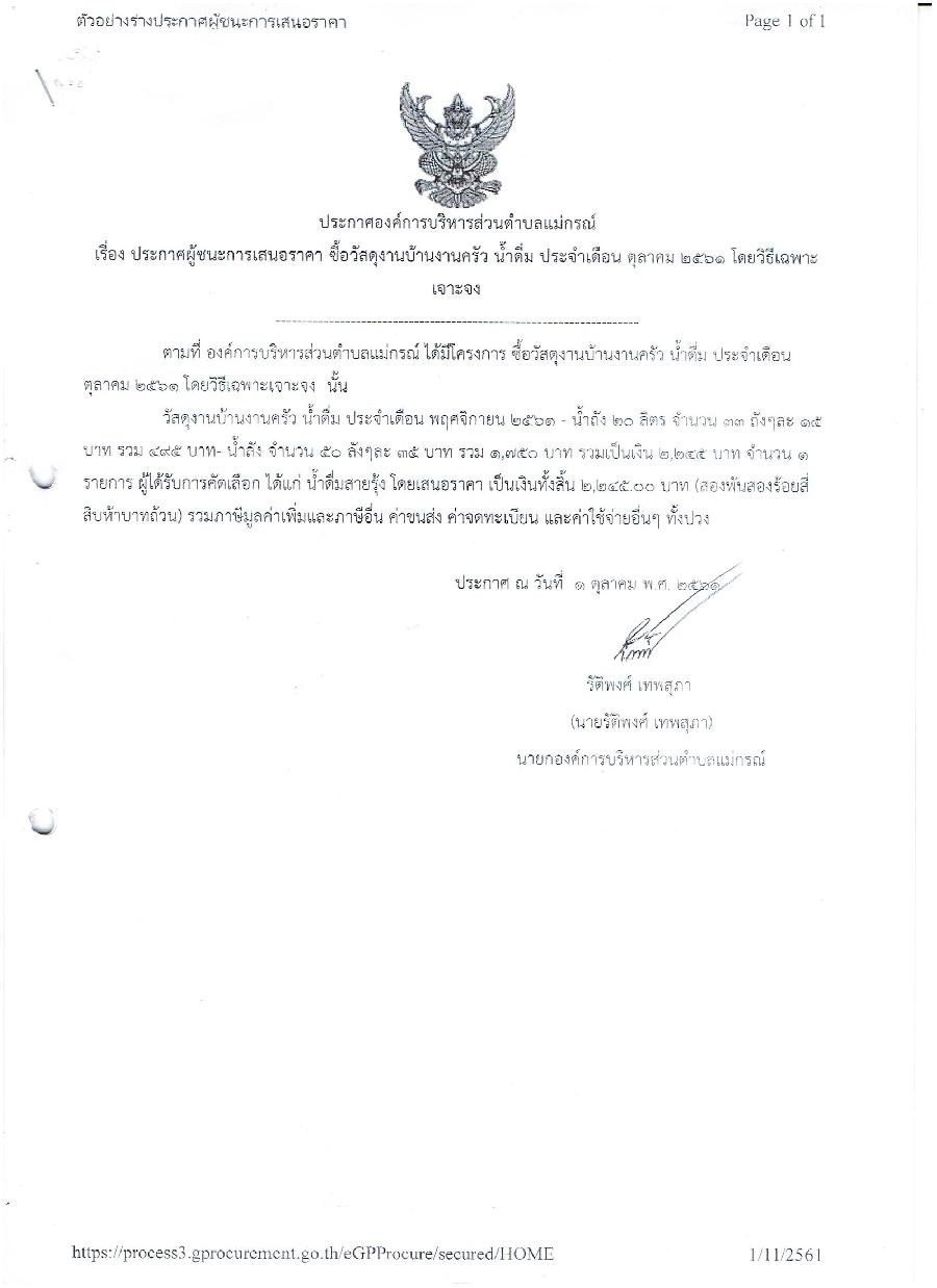 ประกาศผู้ชนะดารดสนอราคา ซื้อวัสดุงานบ้านงานครัว น้ำดื่ม ประจำเดือน ตุลาคม 2561