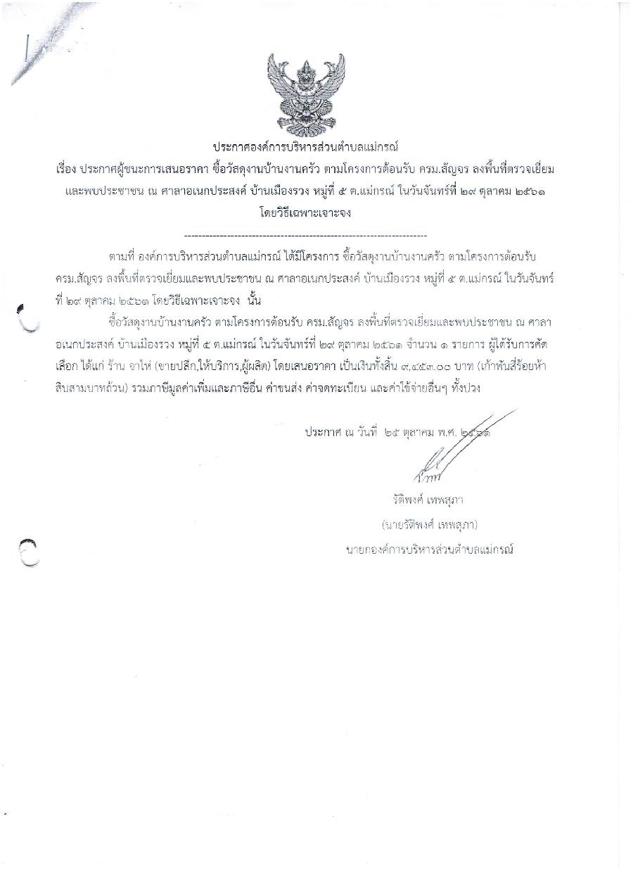 ประกาศผู้ชนะการเสนอราคา ซื้อวัสดุงานบ้านงานครัว ตามโครงการต้อนรับ ครม.สุัญจร ลงพื้นที่ตรวจเยี่ยมและพบประชาชน ศาราอเนกประสงค์ บ้านเมืองรวง หมู่ที่ 5 ต. แม่กรณ์ ในวันจันทร์ที่ 29 ตุลาคม 2561