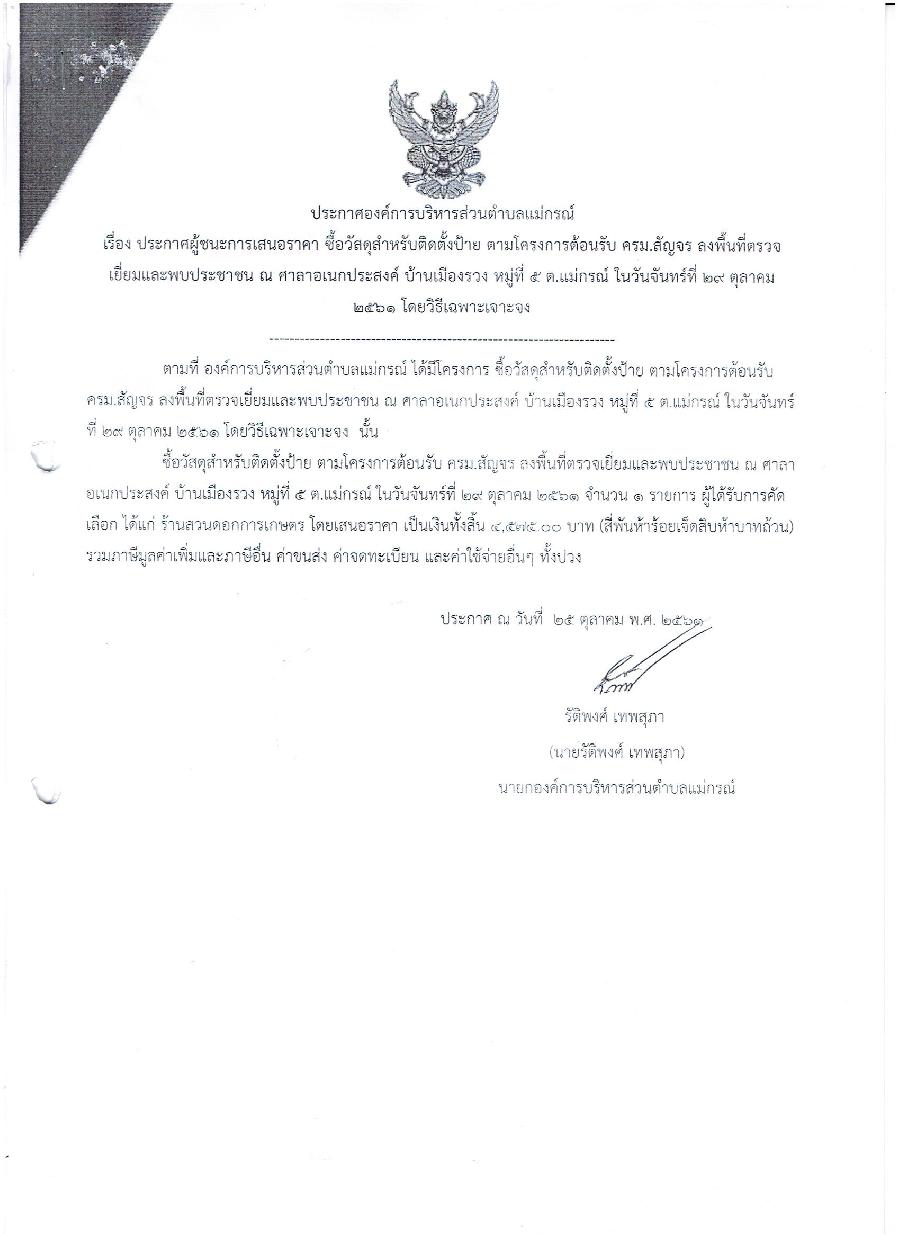 ประกาศผู้ชนะการเสนอราคา ซื้อวัสดุสำนักงานติดตั้งป้าย ตามโครงการต้อนรับ ครม.สุัญจร ลงพื้นที่ตรวจเยี่ยมและพบประชาชน ศาราอเนกประสงค์ บ้านเมืองรวง หมู่ที่ 5 ต. แม่กรณ์ ในวันจันทร์ที่ 29 ตุลาคม 2561