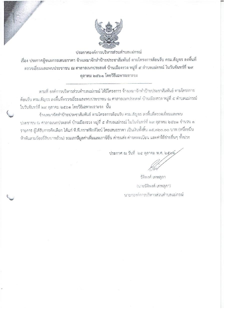 ประกาศผู้ชนะการเสนอราคา จ้างเหมาจักทำป้ายประชาสัมพันธ์ ตามโครงการต้อนรับ ครม.สุัญจร ลงพื้นที่ตรวจเยี่ยมและพบประชาชน ศาราอเนกประสงค์ บ้านเมืองรวง หมู่ที่ 5 ต. แม่กรณ์ ในวันจันทร์ที่ 29 ตุลาคม 2561