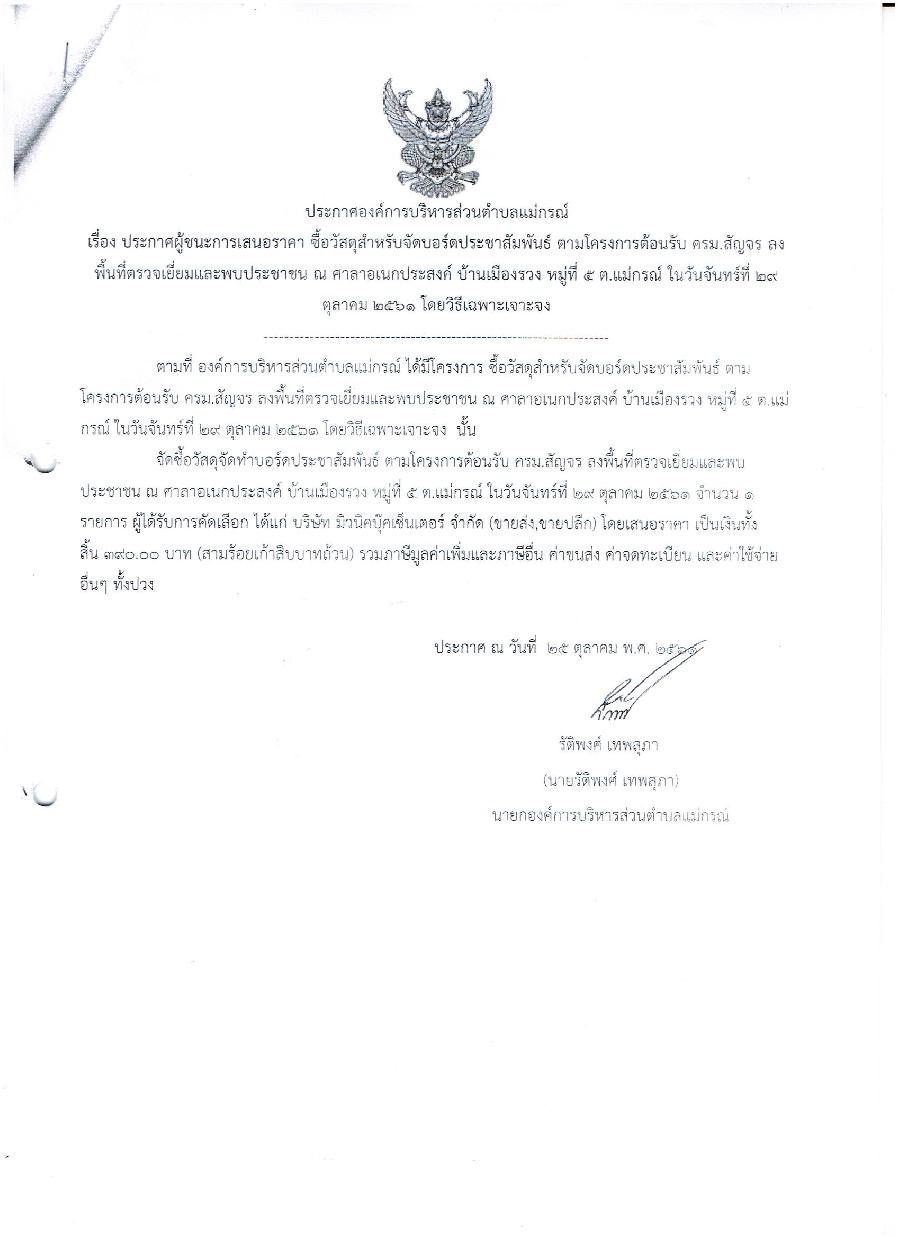 ประกาศผู้ชนะการเสนอราคา ซื้อวัสดุสำหรับทำบอร์ดประชาสัมพันธ์ ตามโครงการต้อนรับ ครม.สุัญจร ลงพื้นที่ตรวจเยี่ยมและพบประชาชน ศาราอเนกประสงค์ บ้านเมืองรวง หมู่ที่ 5 ต. แม่กรณ์ ในวันจันทร์ที่ 29 ตุลาคม 2561