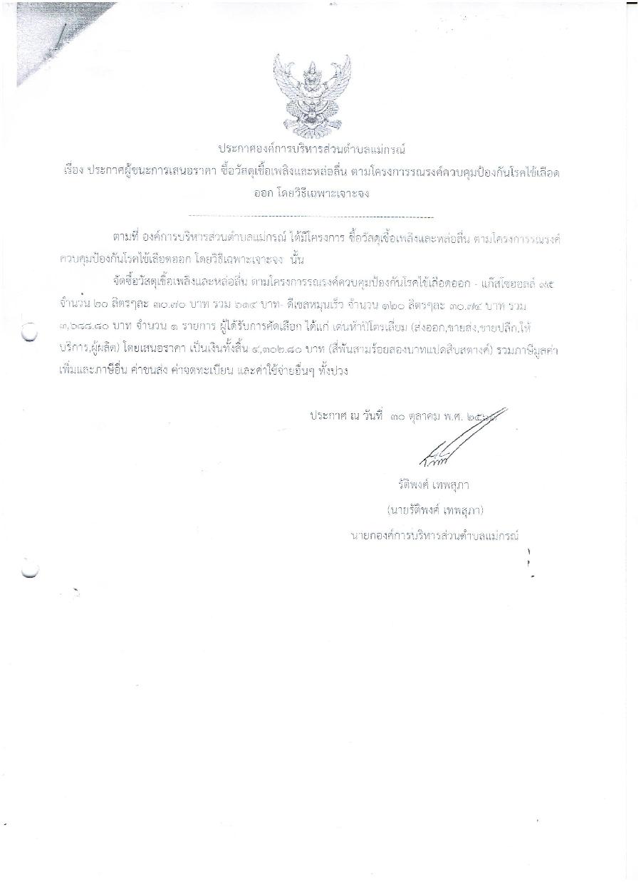 ประกาศผู้ชนะการเสนอราคา ซื้อวัสดุเชื้อเพลิงและหล่อลื่น ตามโครงการรณรงค์ควบคุมป้องกันโรคไข้เลือดออก