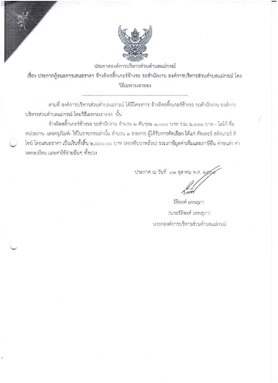 ประกาศผู้ชนะการเสนอราคา จ้างติดสติีกเกอร์ข้างรถ รถสำนักงาน องค์การบริหารส่วนตำบลบแม่กรณ์