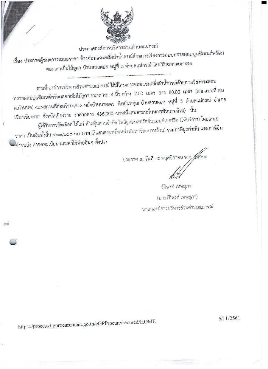 ประกาศผู้ชนะการเสนอราคา จ้างซ่อมแซมตลิ่งลำน้ำกรณ์ด้วยการเรียงกระสอบทรายผสมปูนซีเมนต์พร้อมตอกเสาเข็มไม้ยูคา บ้านสวนดอก หมู่ที่ 3 ตำบลแม่กรณ์