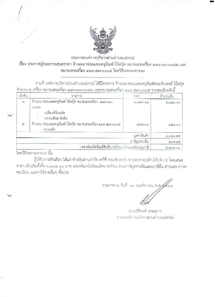ประกาศผู้ชนะการเสนอราคา จ้างเหมาซ่อมแซมครุภัณฑ์ โน๊ตบุ๊ค หมายเลขเครื่อง 416-60-0046 และหมายเลขเครื่อง 416-57-0005