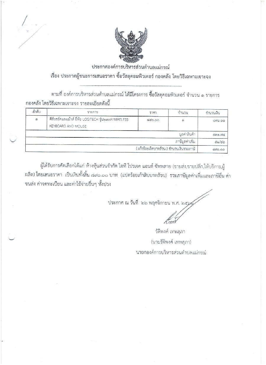 ประกาศผู้ชนะการเสนอราคา ซื้อวัสดุคอมพิวเตอร์ กองคลัง