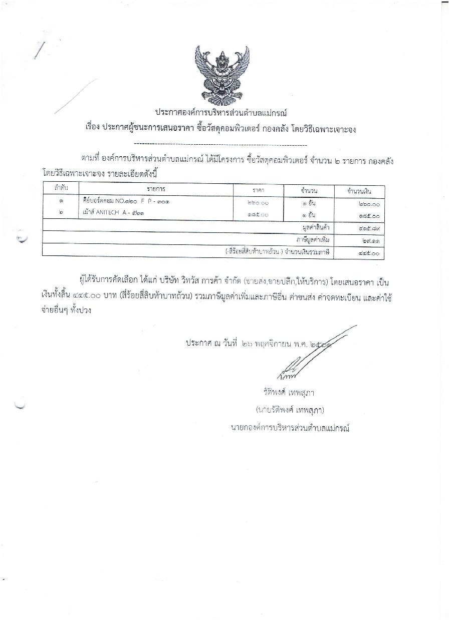 ประกาศผู้ชนะการเสนอราคา ซื้อวัสดุคอมพิวเตอร์ กองคลัง