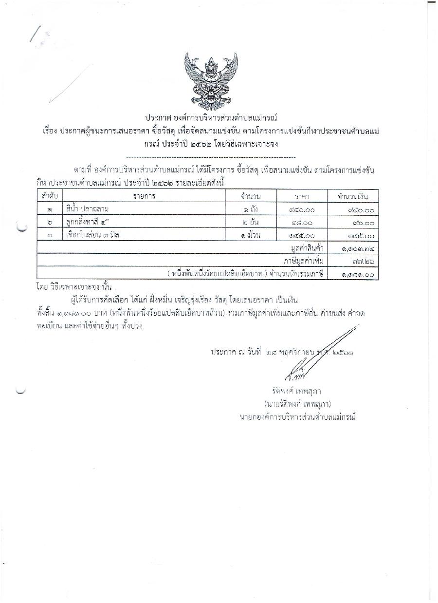 ประกาศผู้ชนะการเสนอราคา ซื้อวัสดุ เพื่อจัดสนามแข่งขัน ตามโครงการแข่งขันกีฬาประชาชนตำบลแม่กรณ์ ประจำปี 2562