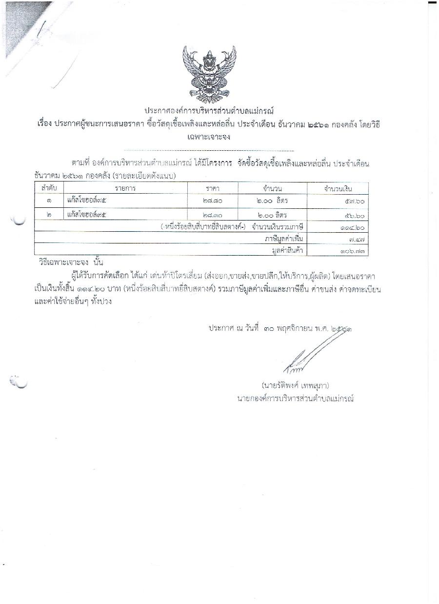 ประกาศผู้ชนะการเสนอราคา ซื้อวัสดุเชื้อเพลิงและหลื่อลื่น ประจำเดือน ธันวาคม 2561 กองคลัง