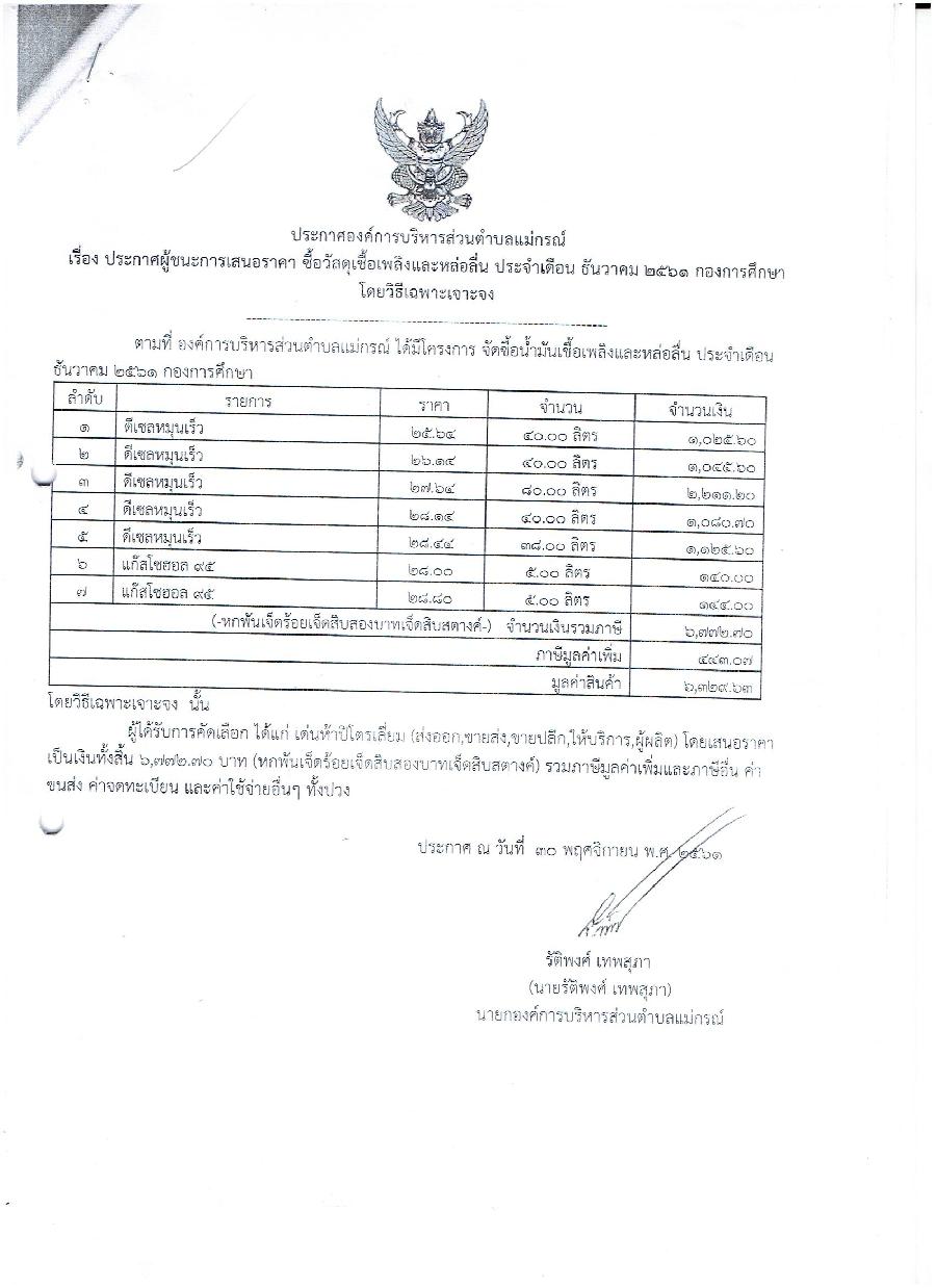 ประกาศผู้ชนะการเสนอราคา ซื้อวัสดุเชื้อเพลิงและหลื่อลื่น ประจำเดือน ธันวาคม 2561 กองการศึกษา