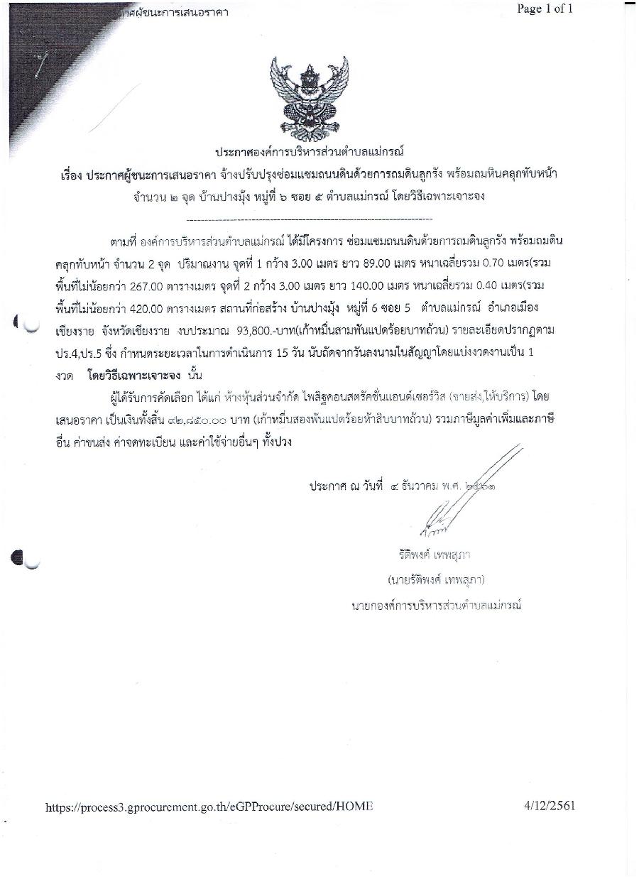 ประกาศผู้ชนะการเสนอราคา จ้างปรับปรุงซ่อมแซมถนนดินด้วยการถมดินลูกรัง พร้อมถมหินคลุกทับหน้า จำนวน 2 จุด บ้านปางมุ้ง หมู่ที่ 6 ซอย 5 ตำบลแม่กรณ์