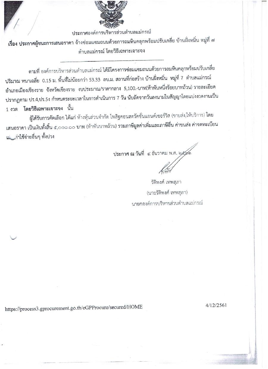 ประกาศผู้ชนะการเสนอราคา จัางซ่อมแซมถนนด้วยการถมหินคลุกพร้อมปรับเกลี่ย บ้านฝั่งหมิ่น หมู่ที่ 7 ตำบลแม่กรณ์