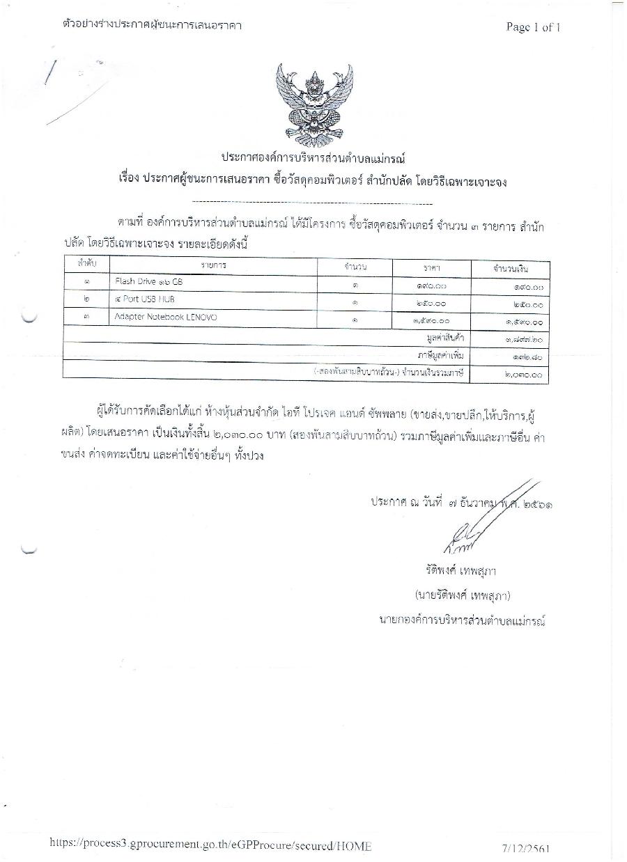 ประกาศผู้ชนะการเสนอราคา ซื้อวัสดุคอมพิวเตอร์ สำนักปลัด