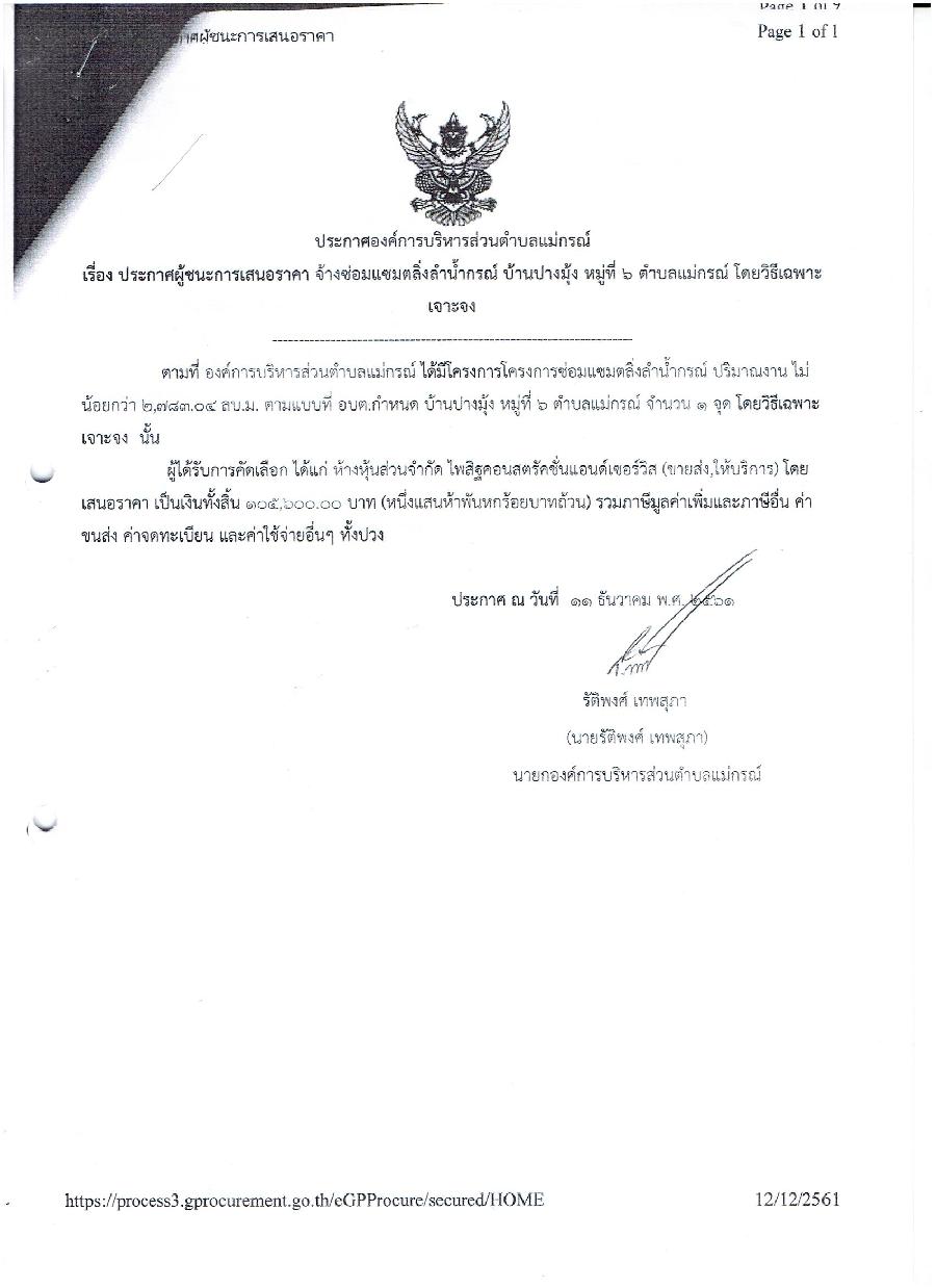 ประกาศผู้ชนะการเสนอราคา จ้างซ่อมแซมตลิ่งลำน้ำกรณ์ บ้านปางมุ้ง หมู่ที่ 6 ตำบลแม่กรณ์