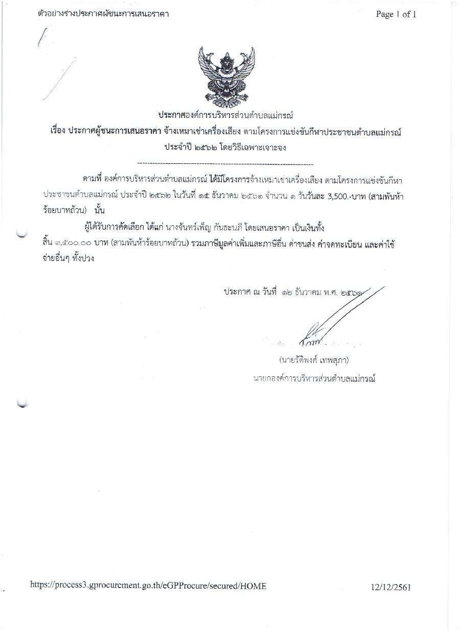 ประกาศผู้ชนะการเสนอราคา จ้างเหมาเช่าเครื่องเสียง ตามโครงการแข่งขันกีฬาประจำตำบลแม่กรณ์ ประจำปี 2562