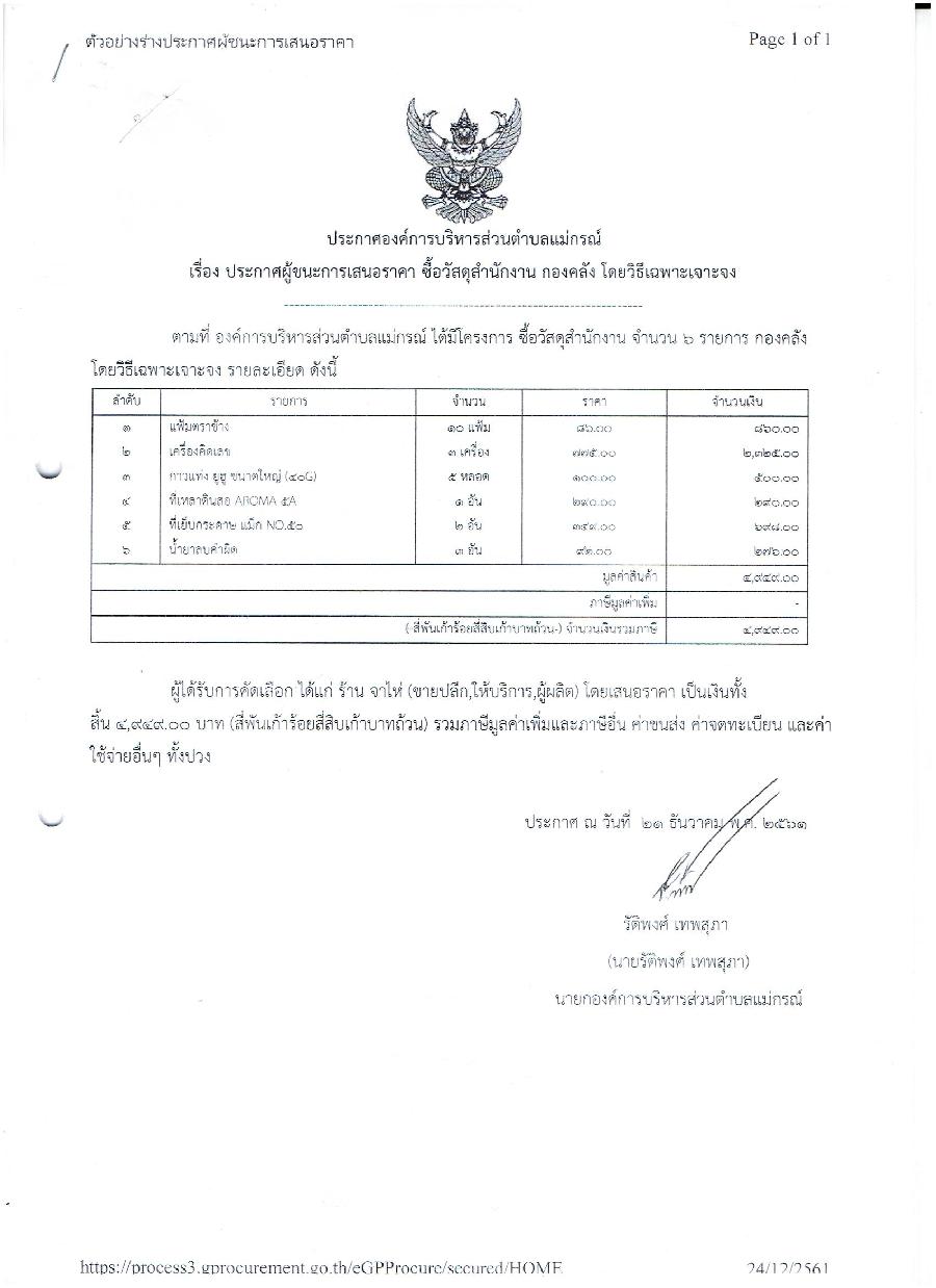 ประกาศผู้ชนะการเสนอราคา จัดซื้อวัสดุสำนักงาน กองคลัง