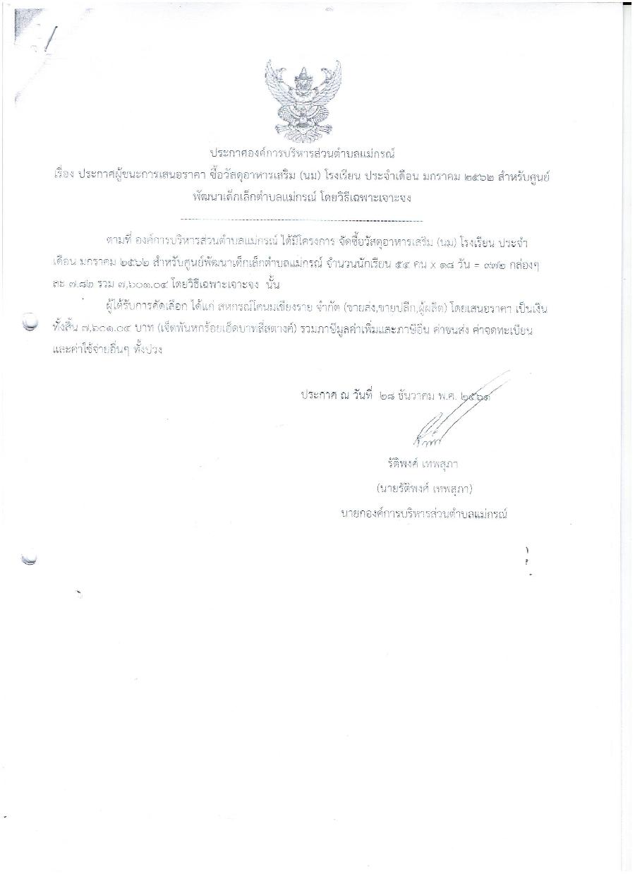 ประกาศผู้ชนะการเสนอราคา ซื้อวัสดุอาหารเสริม(นม) โรงเรียน ประจำเดือน มกราคม 2562 สำหรับศูนย์พัฒนาเด็กเล็กตำบลแม่กรณ์
