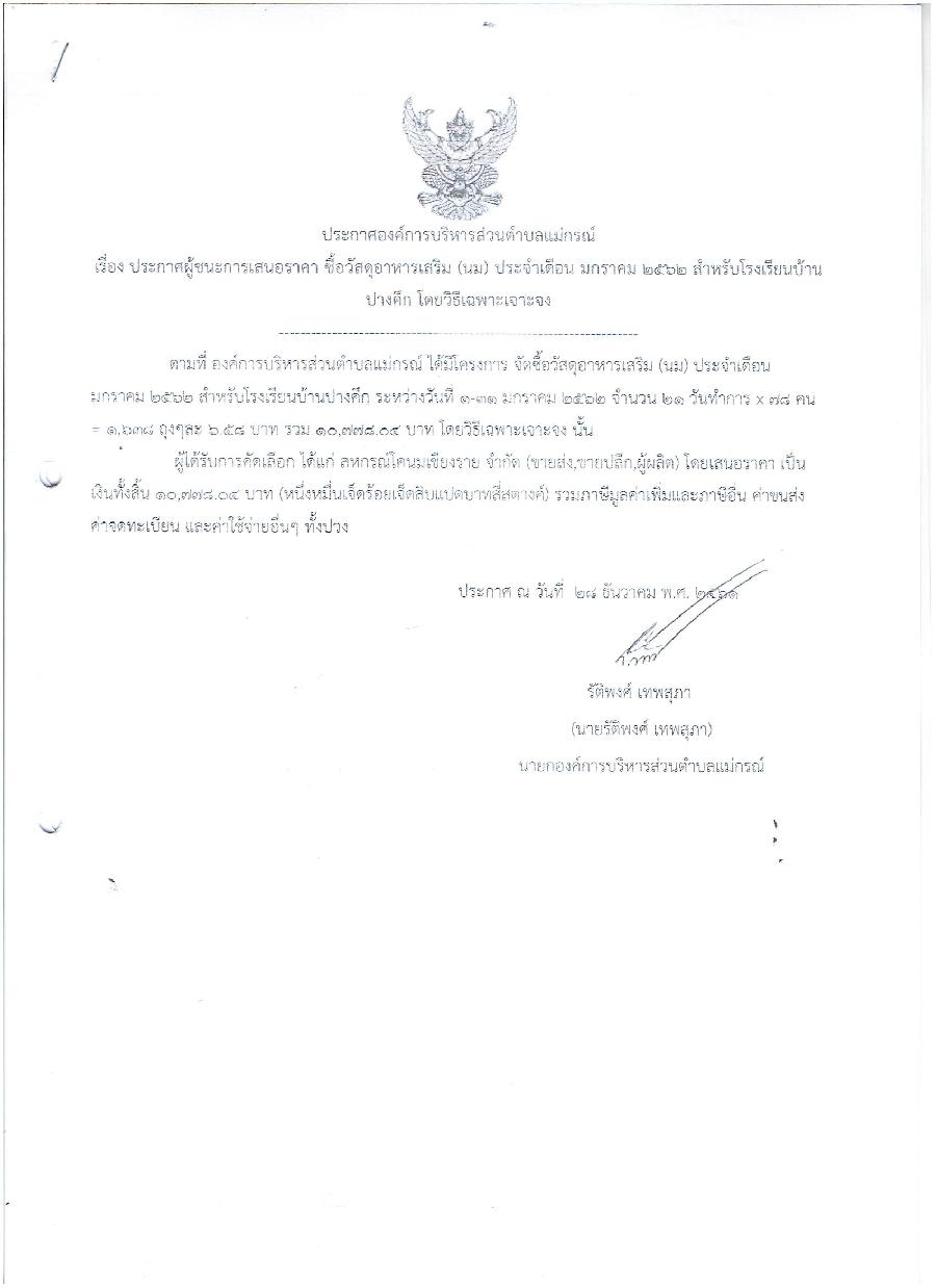 ประกาศผู้ชนะการเสนอราคา ซื้อวัสดุอาหารเสริม(นม) โรงเรียน ประจำเดือน มกราคม 2562 สำหรับโรงเรียนบ้านปางคึก
