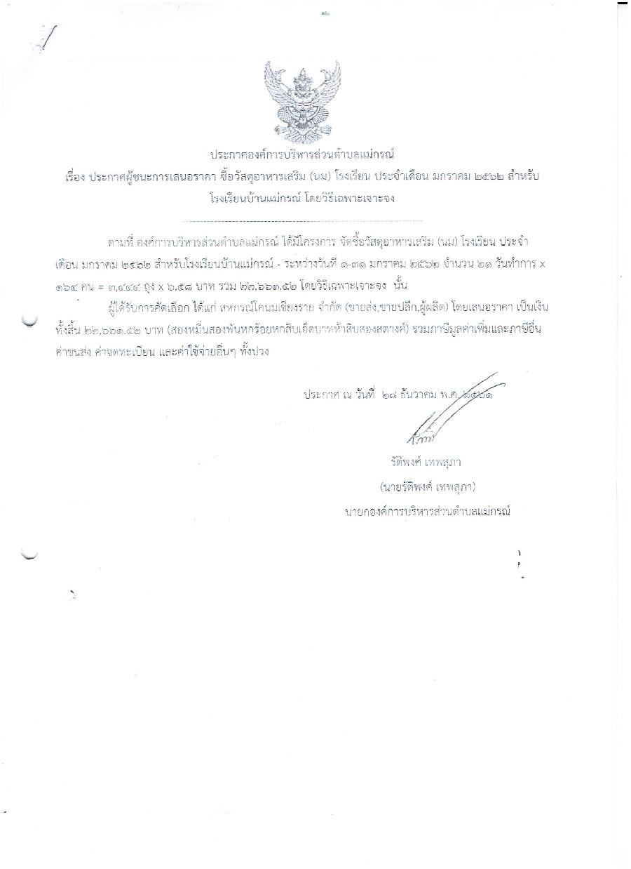 ประกาศผู้ชนะการเสนอราคา ซื้อวัสดุอาหารเสริม(นม) โรงเรียน ประจำเดือน มกกราคม 2562 สำหรับโรงเรียนบ้านแม่กรณ์