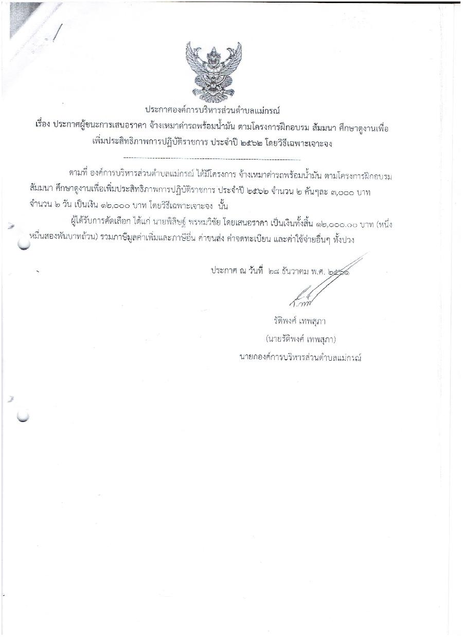 ประกาศผู้ชนะการเสนอราคา จ้างเหมาค่ารถพร้อมน้ำมัน ตามโครงการฝึกอบรม สัมมนา ศึกษาดูงานเพื่อเพิ่มประสิทธิภาพการปฏิบัติราชการ ประจำปี 2562