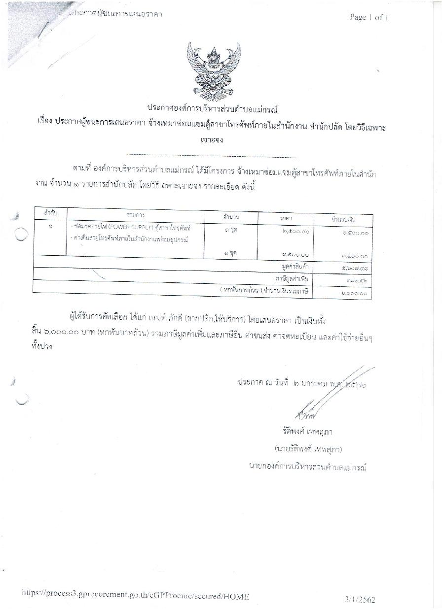 ประกาศผู้ชนะการเสนอราคา จ้างเหมาซ่อมแซมตู้สาขาโทรศัพท์ภายในสำนักงาน สำนักปลัด