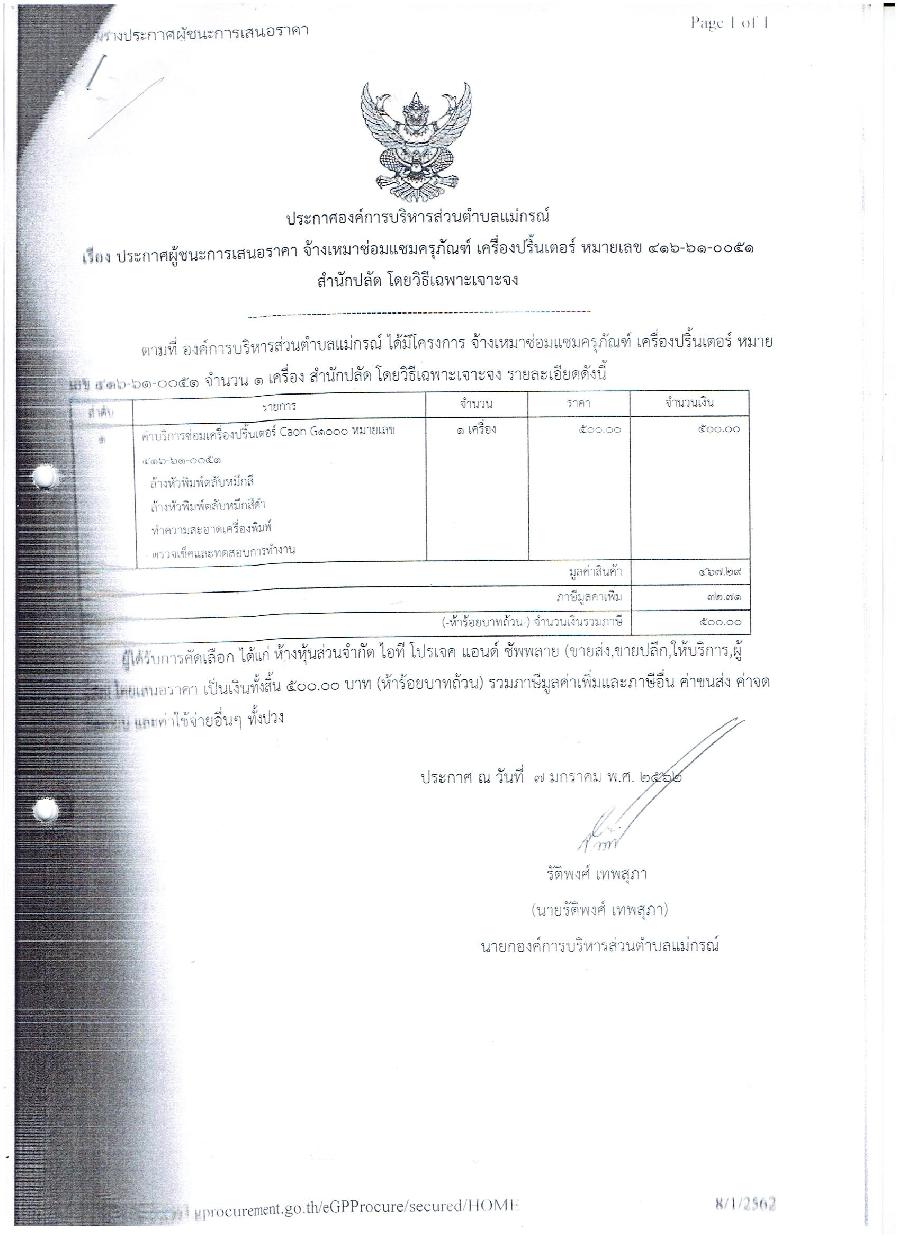 ประกาศผู้ชนะการเสนอราคา จ้างเหมาซ่อมแซมครุภัณฑ์ เครื่องปริ้นเตอร์ หมายเลขเครื่อง 416-61-0051 สำนักปลัด