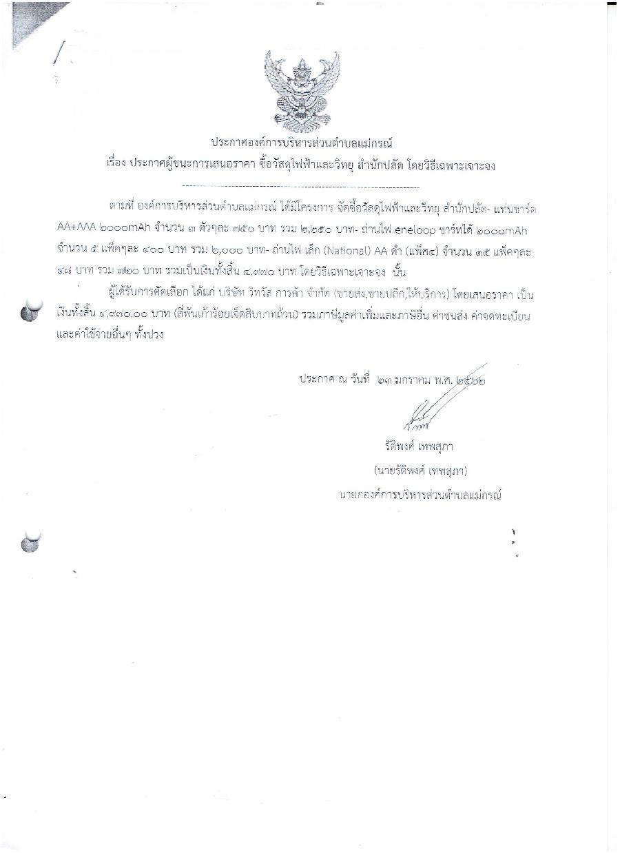ประกาศผู้ชนะการเสนอราคา ซื้อวัสดุไฟฟ้าและวิทยุ สำนักปลัด