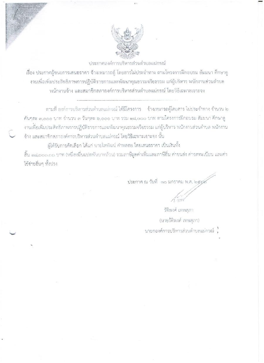 ประกาศผู้ชนะการเสนอราคา จ้างเหมารถตู้ โดยสารไม่ประจำทาง ตามโครงการฝึกอบรม สัมมนา ศึกษาดูงานเพื่อเพิ่มประสิทธิภาพการปฏิบัติราชการและพัฒนาคุณธรรมจริยธรรม แก่ผู้บริหาร พนักงานส่วนตำบล พนักงานจ้าง และสมาช