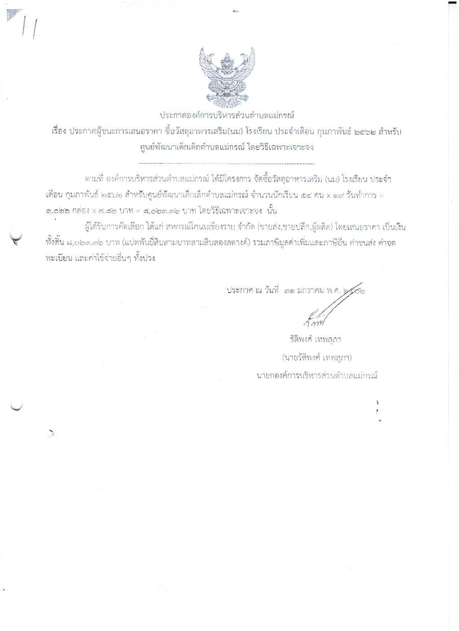 ประกาศผู้ชนะการเสนอราคา ซื้อวัสดุอาหารเสริม(นม) โรงเรียน ประจำเดือน กุมภาพันธ์ 2562 สำหรับศูนย์พัฒนาเด็กเล็กตำบลแม่กรณ์