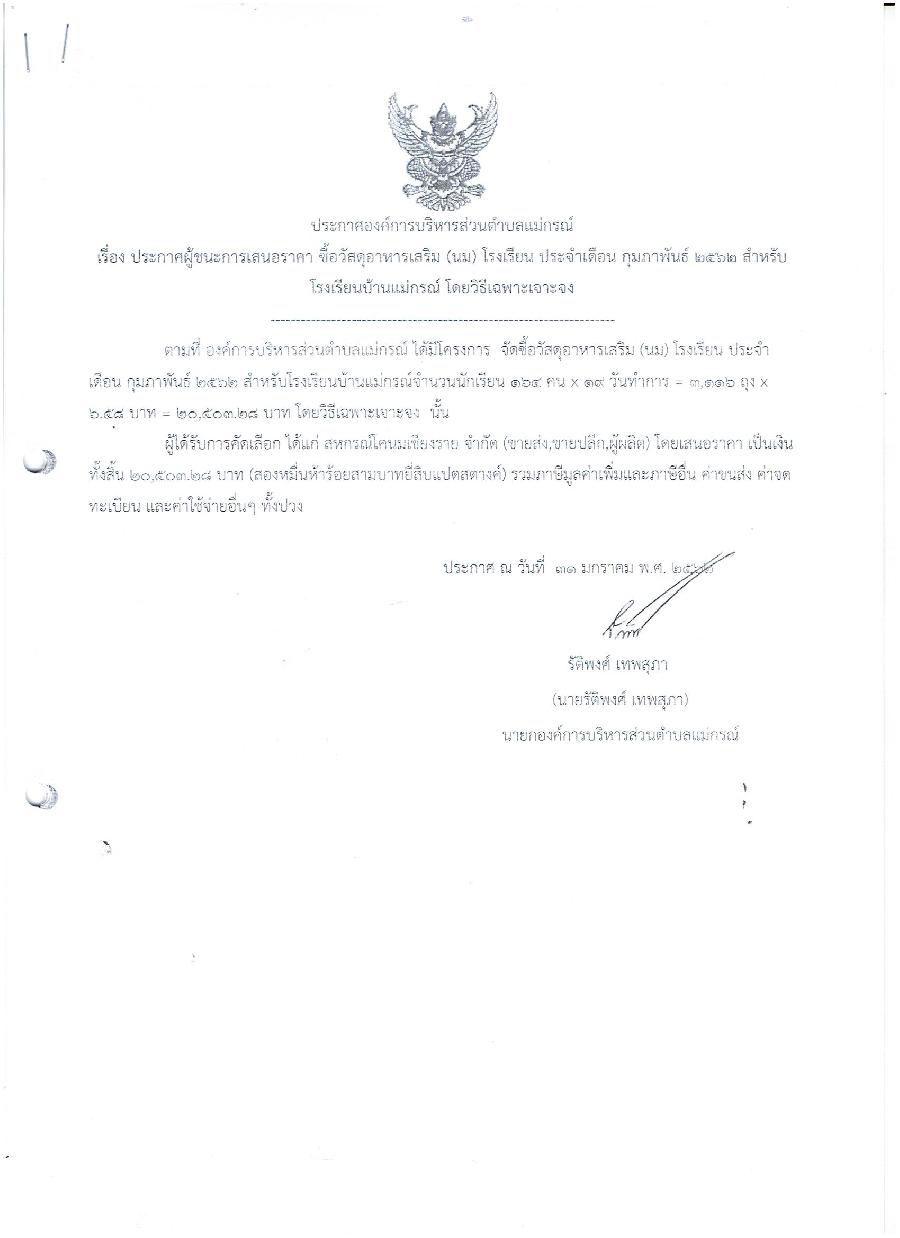 ประกาศผู้ชนะการเสนอราคา ซื้อวัสดุอาหารเสริม(นม) โรงเรียน ประจำเดือน กุมภาพันธ์ 2562 สำหรับโรงเรียนบ้านแม่กรณ์