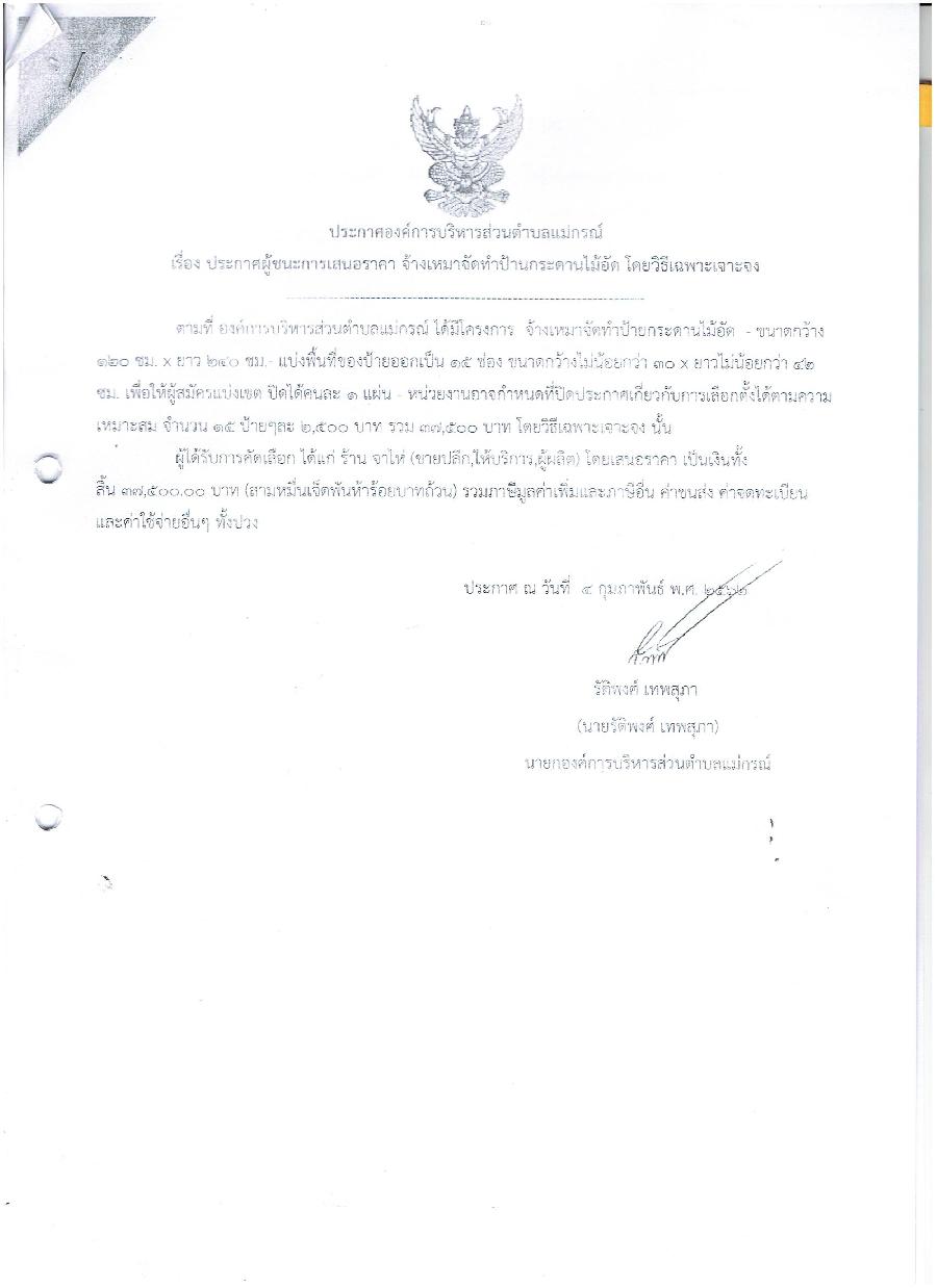 ประกาศผู้ชนะการเสนอราคา จ้างเหมาจักทำป้ายกระดานไม้อัด