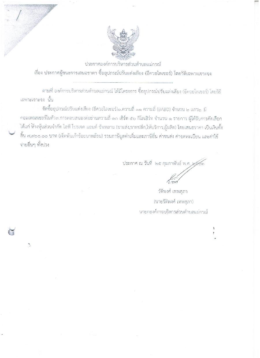 ประกาศผู้ชนะการเสนอราคา ซื้ออุปกรณ์ปรับแต่งเสียง (อีควอไลเซอร์)