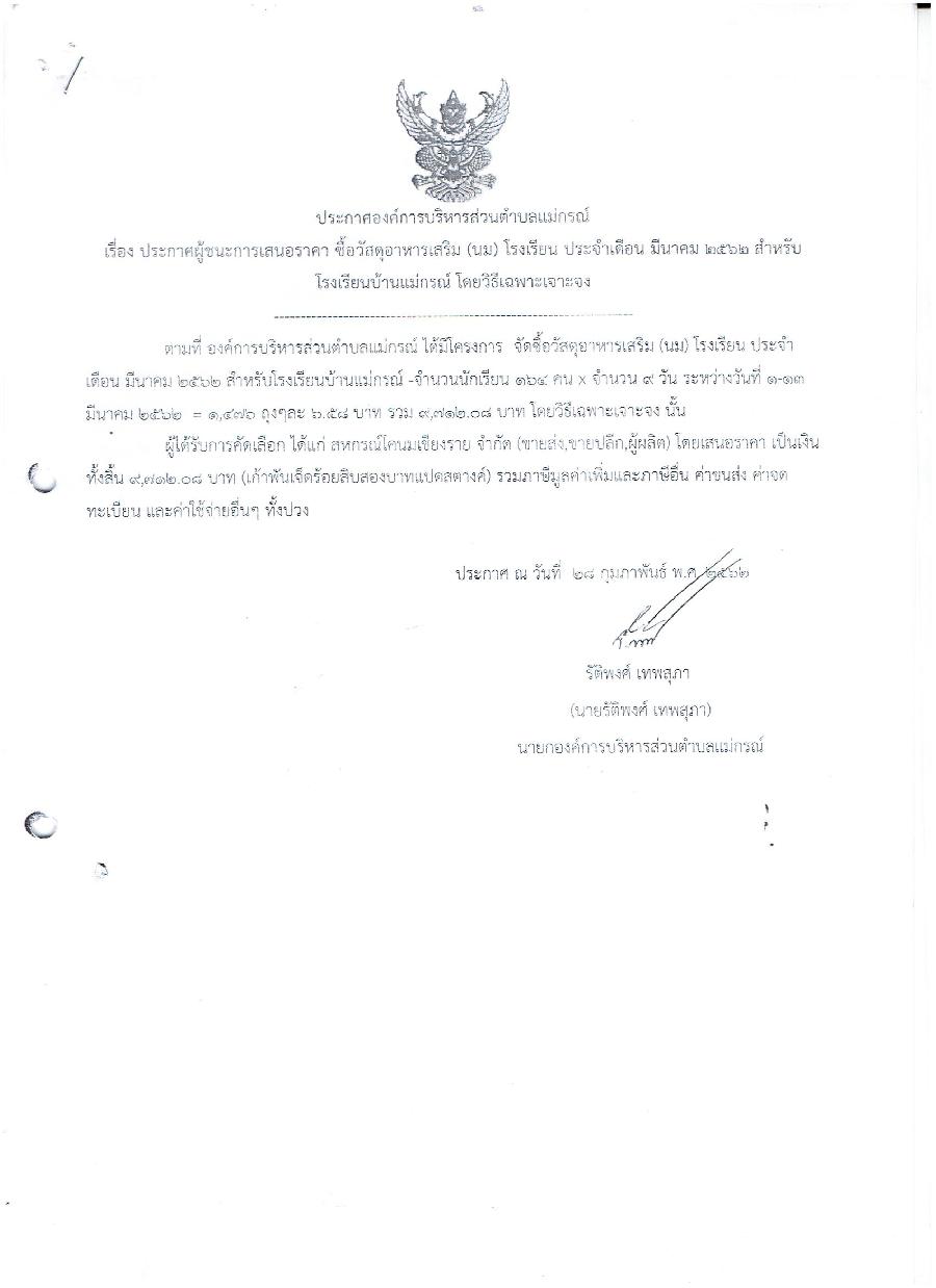 ประกาศผู้ชนะการเสนอราคา ซื้อวัสดุอาหารเสริม(นม) โรงเรียน ประจำเดือน มีนาคม 2562 สำหรับโรงเรียนบ้านแม่กรณ์