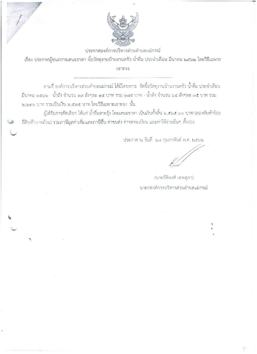 ประกาศผู้ชนะการเสนอราคา ซื้อวัสดุงานบ้านงานครัว น้ำดื่ม ประจำเดือน มีนาคม 2562