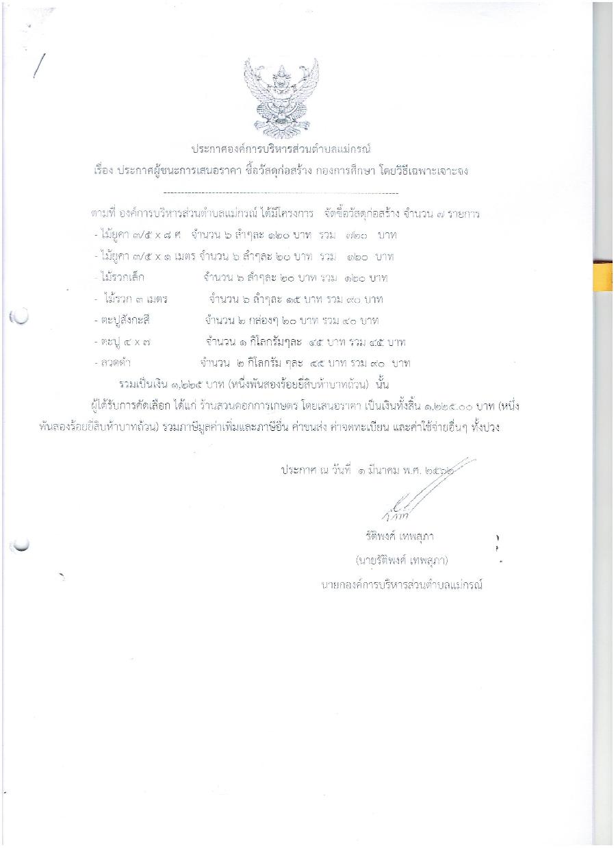 ประกาศผู้ชนะการเสนอราคา ซื้อวัสดุก่อสร้าง กองการศึกษา