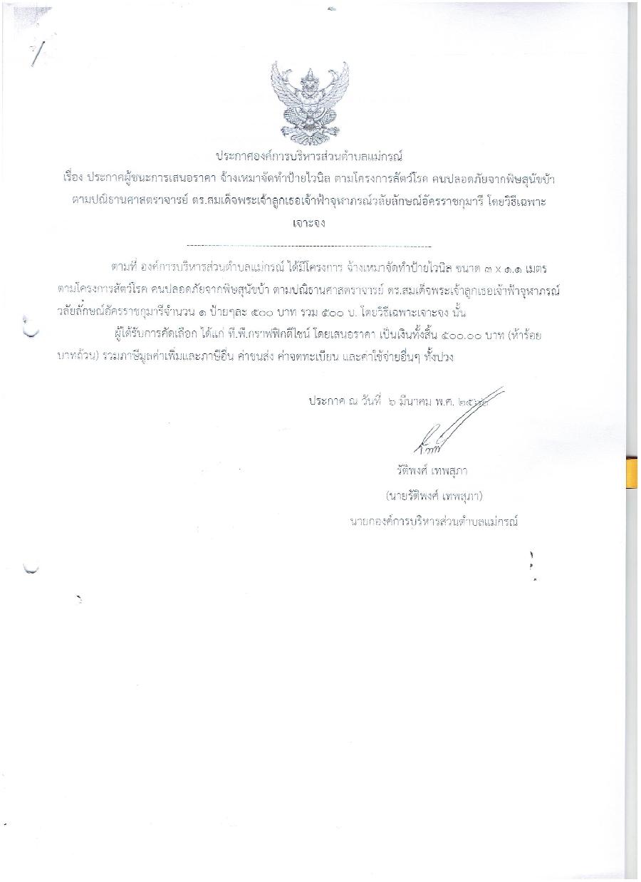 ประกาศผู้ชนะการเสนอราคา จ้างเหมาจัดทำป้ายไวนิล ตามโครงการสัตว์โรค คนปลอดภัยจากพิษสุนัขบ้าตามปณิธานศาสตราจารย์ ดร.สมเเด็จพระเจ้าลูกเธอเจ้าฟ้าจุฬาภรณ์วลัยลักษณ์อัครราชกุมารี